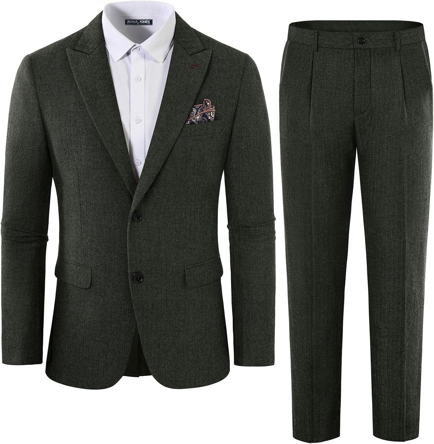 PJ PAUL JONES Mens 2 Piece Suit Vintage Herringbone Tweed Suits 2 Button Peak Lapel Blazer Pants Set(Army Green)