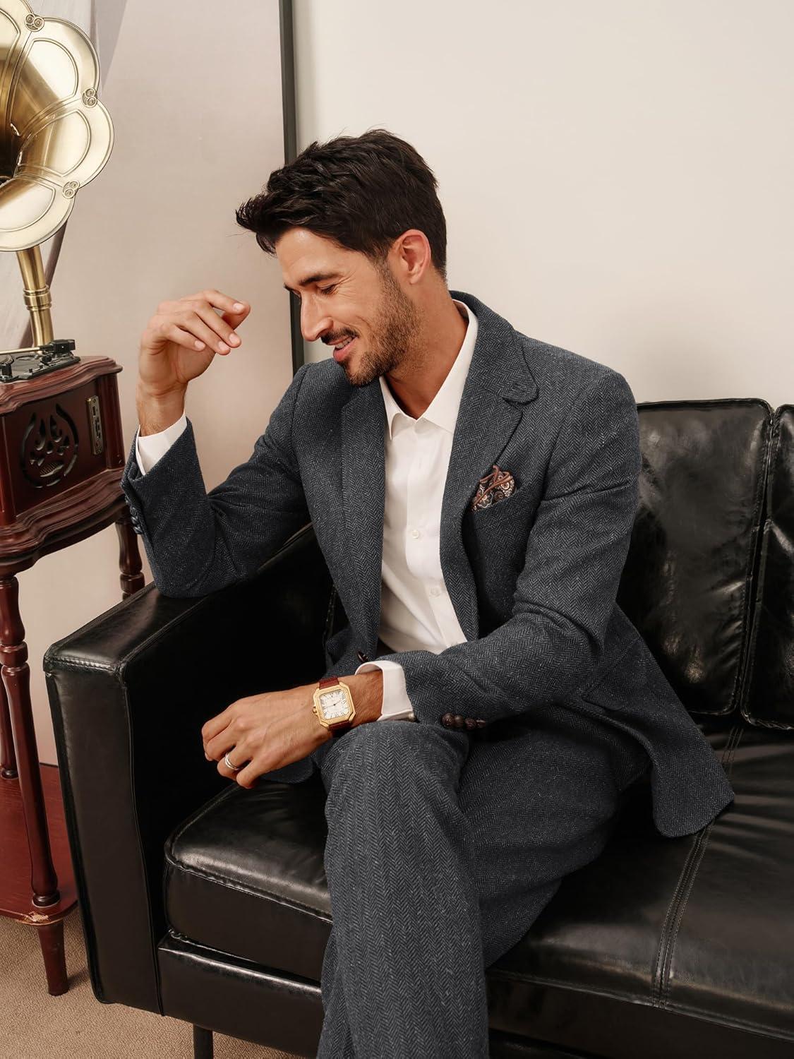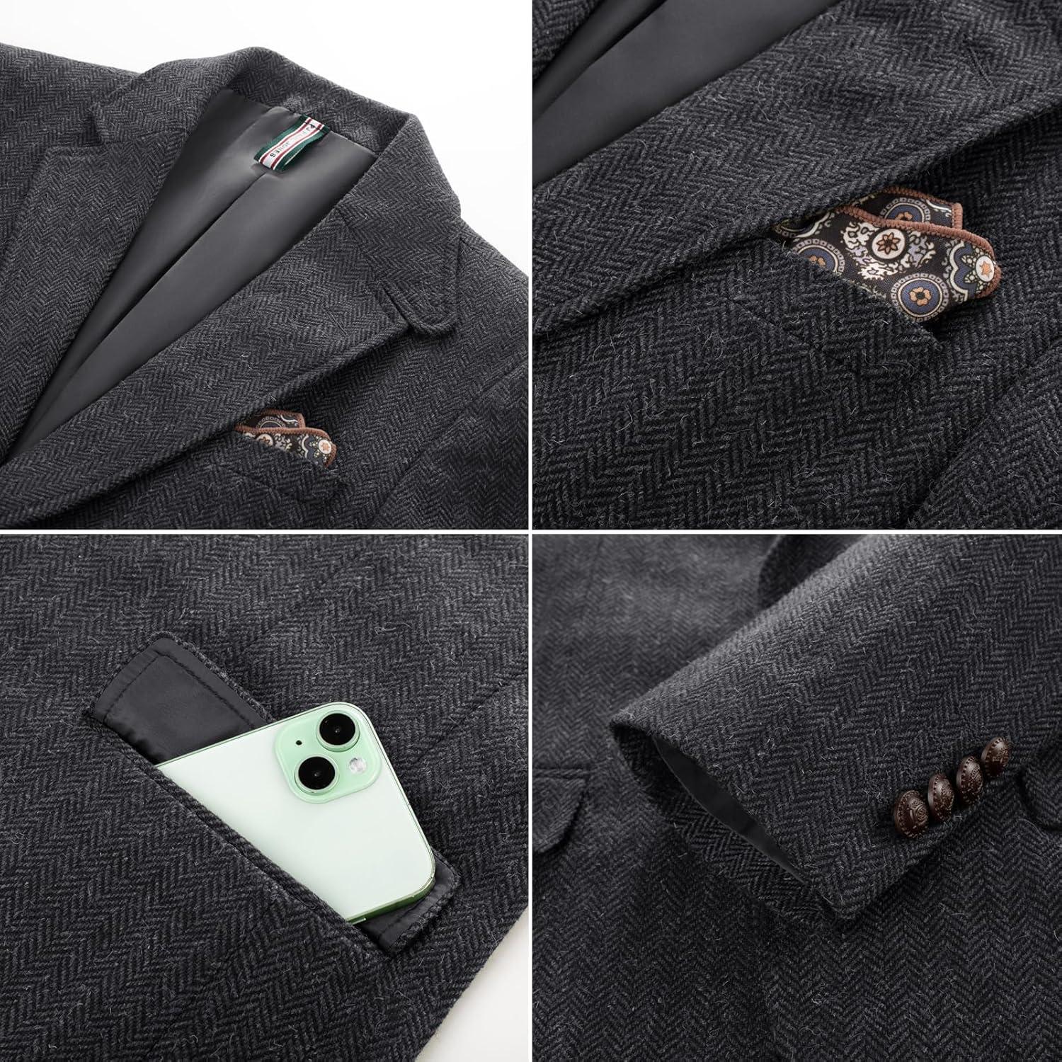 PJ PAUL JONES Mens Blazer Vintage Wool Blend Sport Coat Herringbone Tweed Blazer Suit Jacket with Pocket Square(Dark Gray)