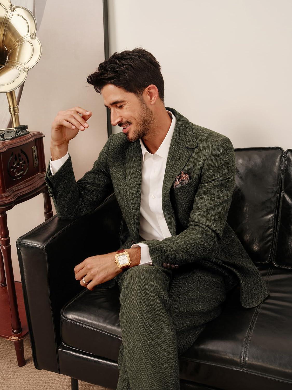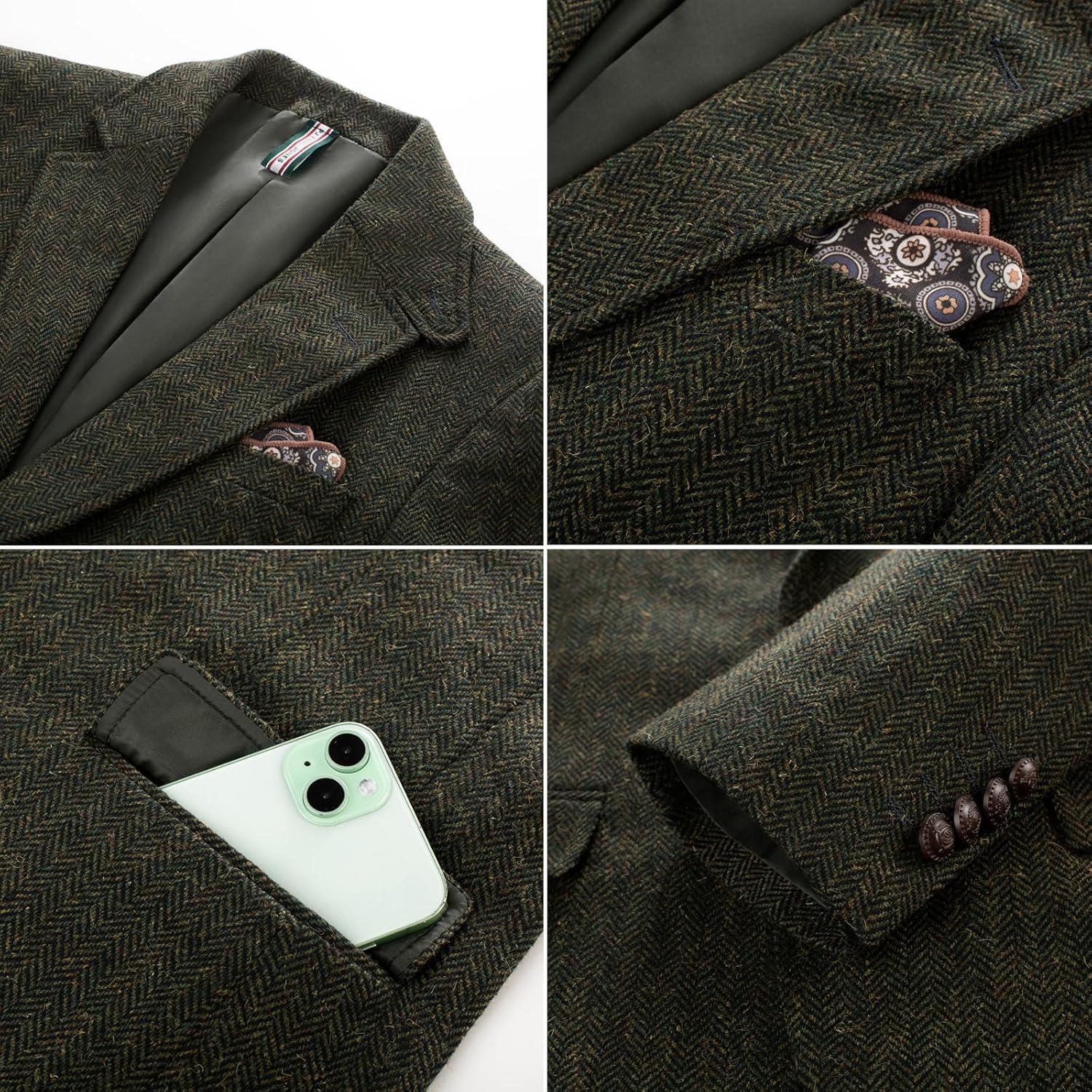 PJ PAUL JONES Mens Blazer Vintage Wool Blend Sport Coat Herringbone Tweed Blazer Suit Jacket with Pocket Square(Green)