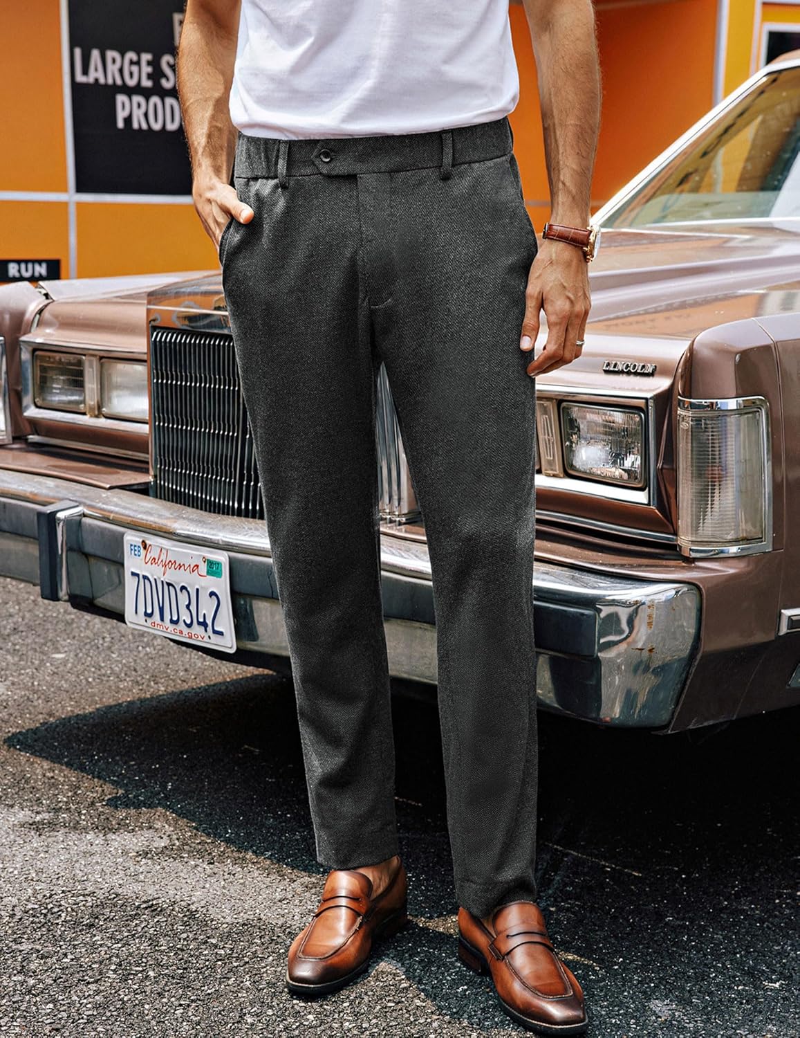PJ PAUL JONES Mens Business Herringbone Pants Retro Knit Suit Pants Stretchy Regular Fit Flat Front Tapered Trousers with Pockets M, Black + Dark Grey