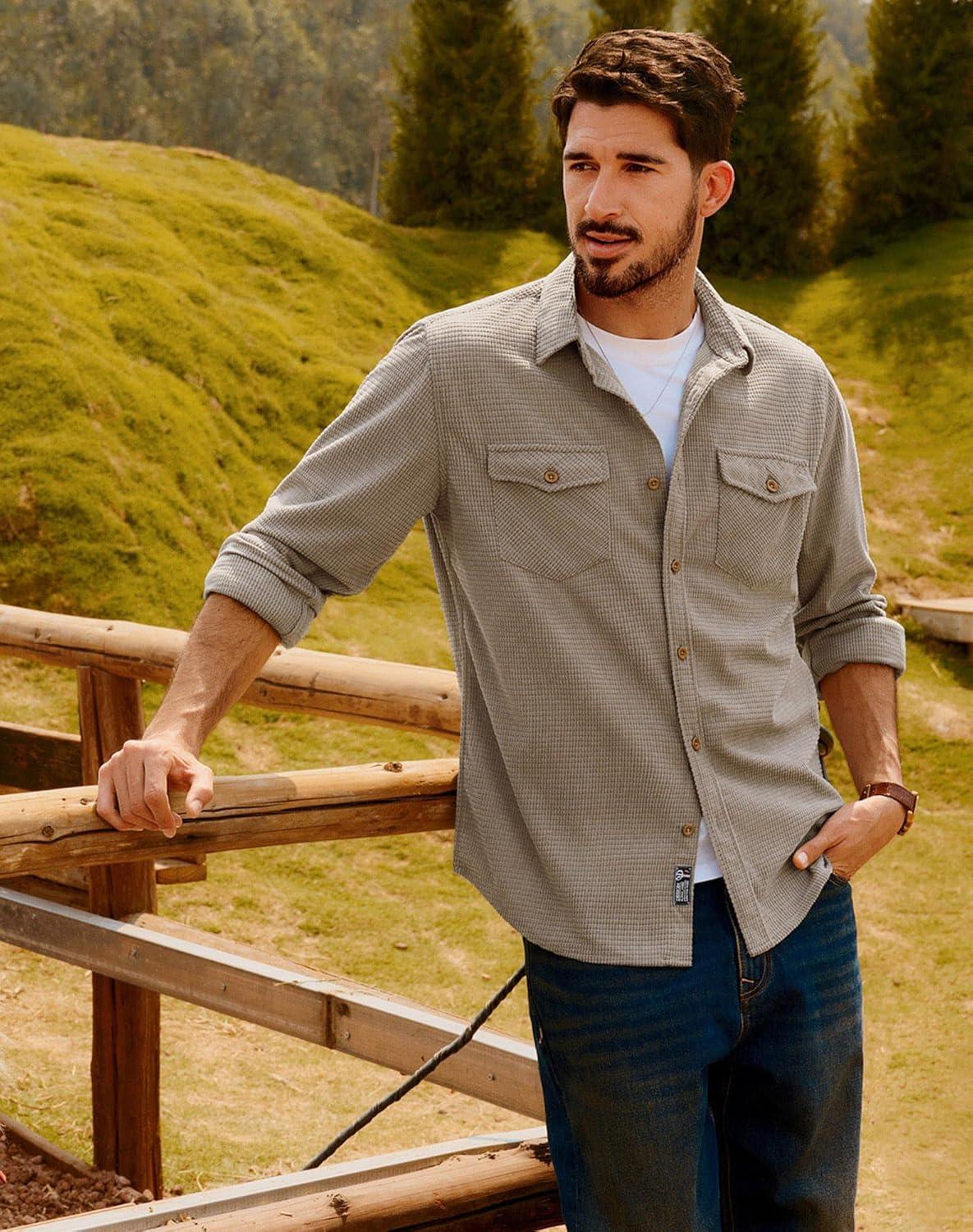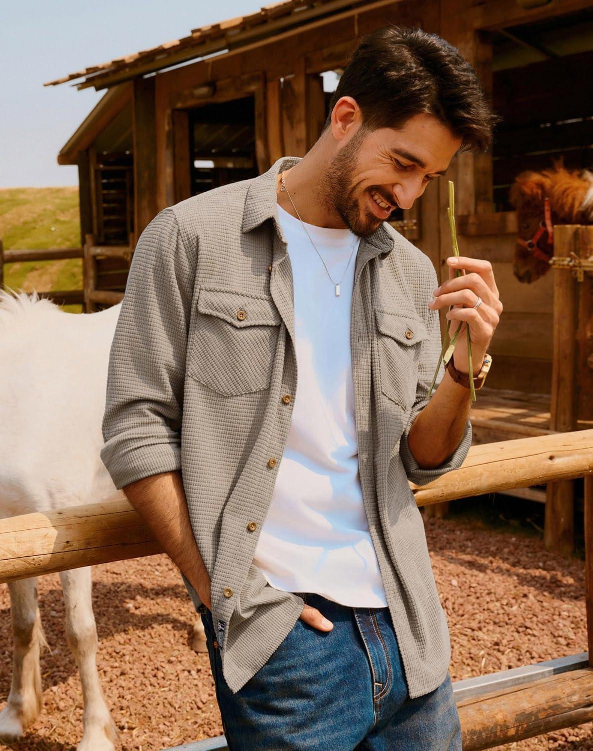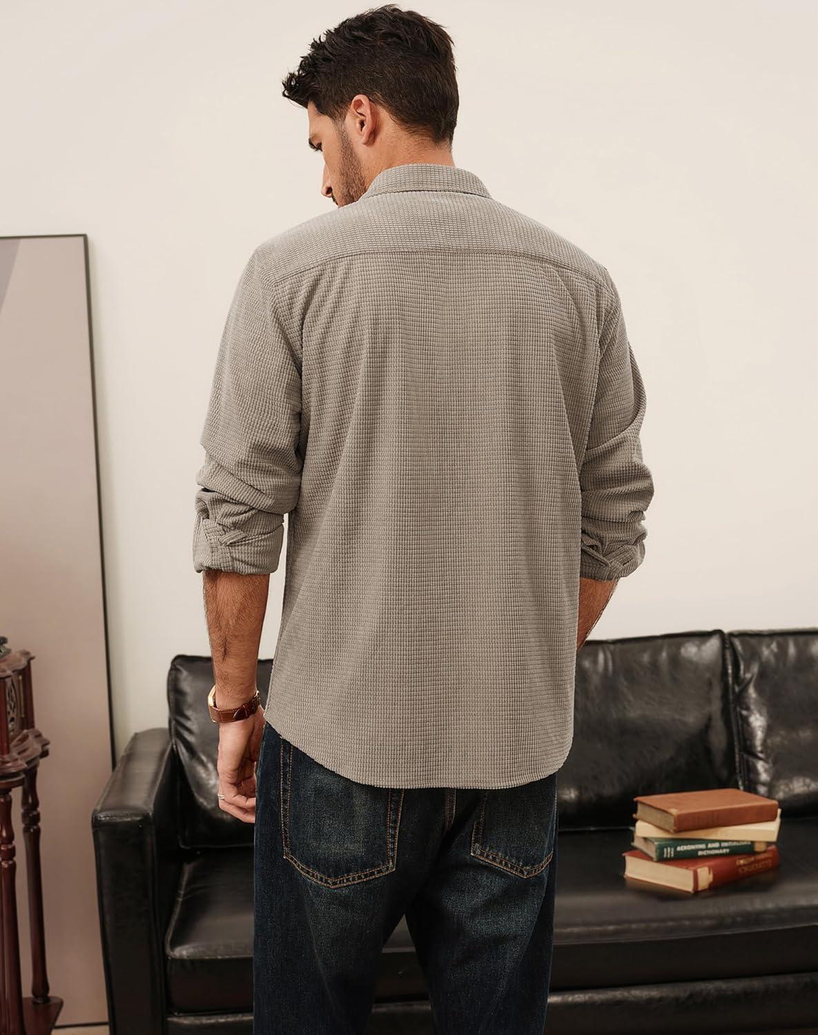 PJ PAUL JONES Men’s Button Down Waffle Textured Shirt Casual Long Sleeve Wrinkle Free Untucked Shirts with Flap Pockets(Light Gray)