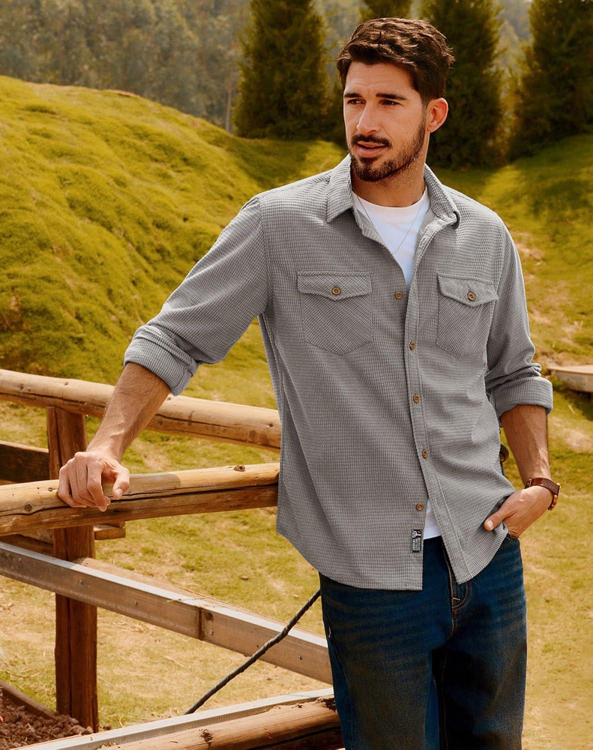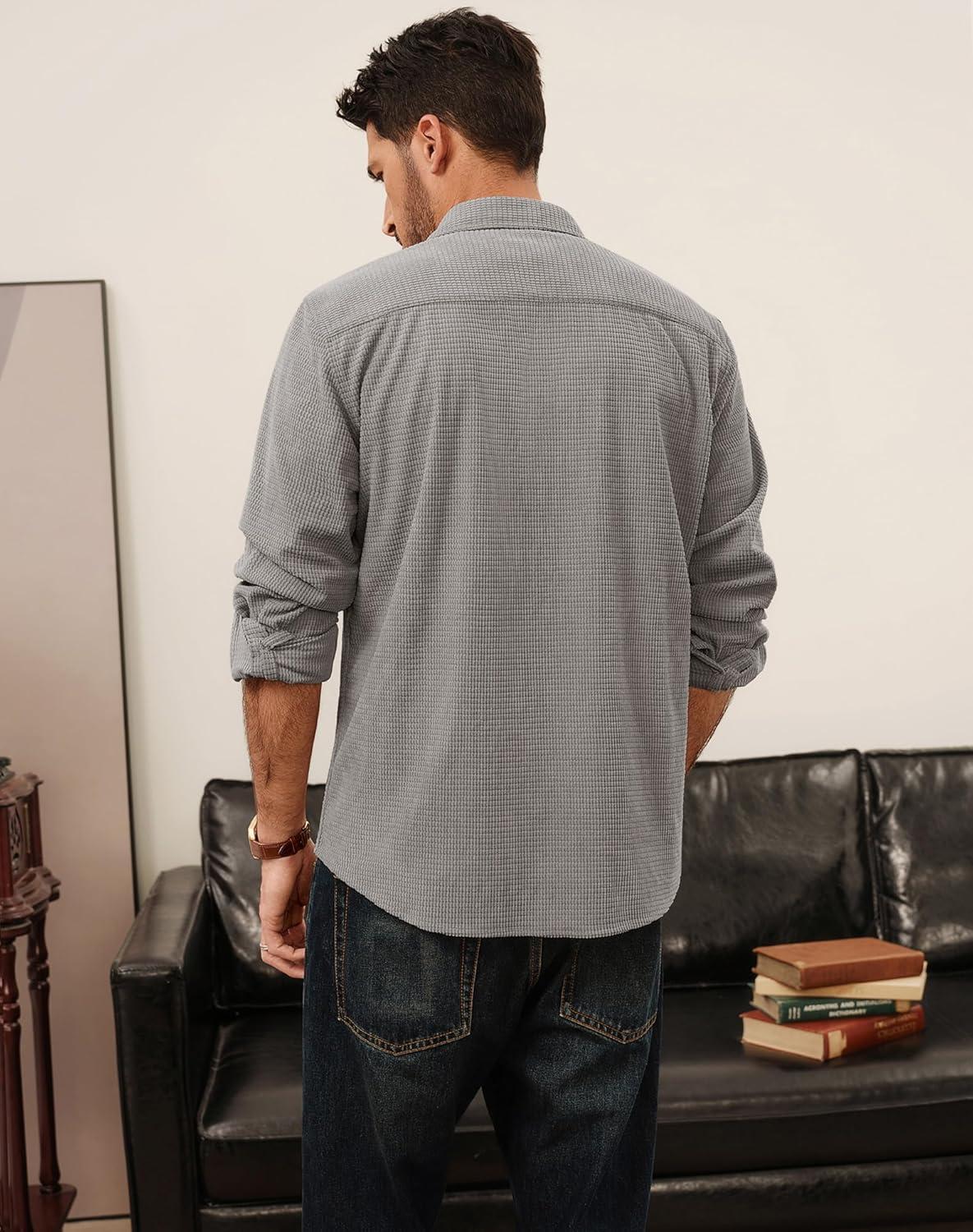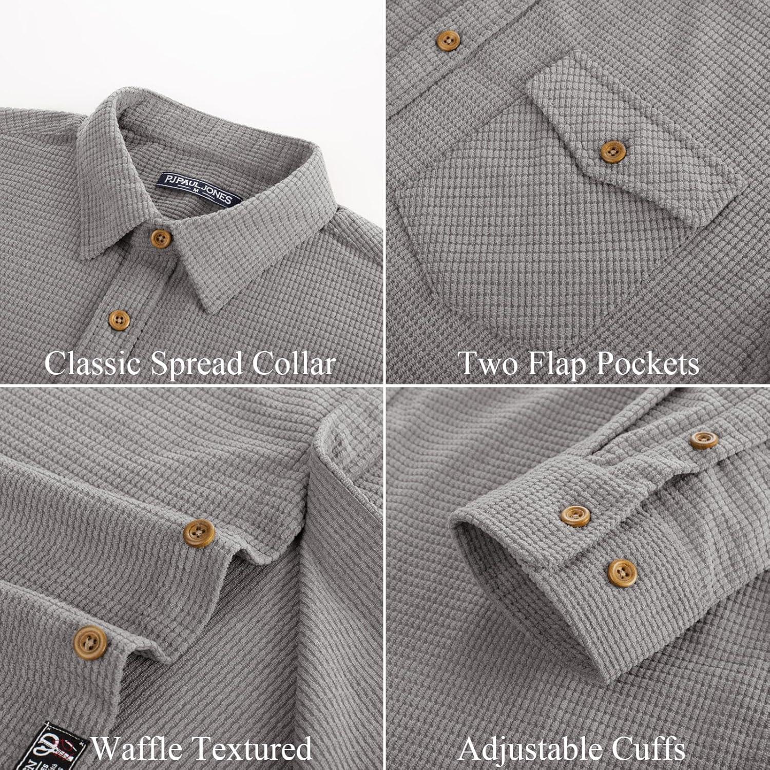 PJ PAUL JONES Men’s Button Down Waffle Textured Shirt Casual Long Sleeve Wrinkle Free Untucked Shirts with Flap Pockets(Light Gray)