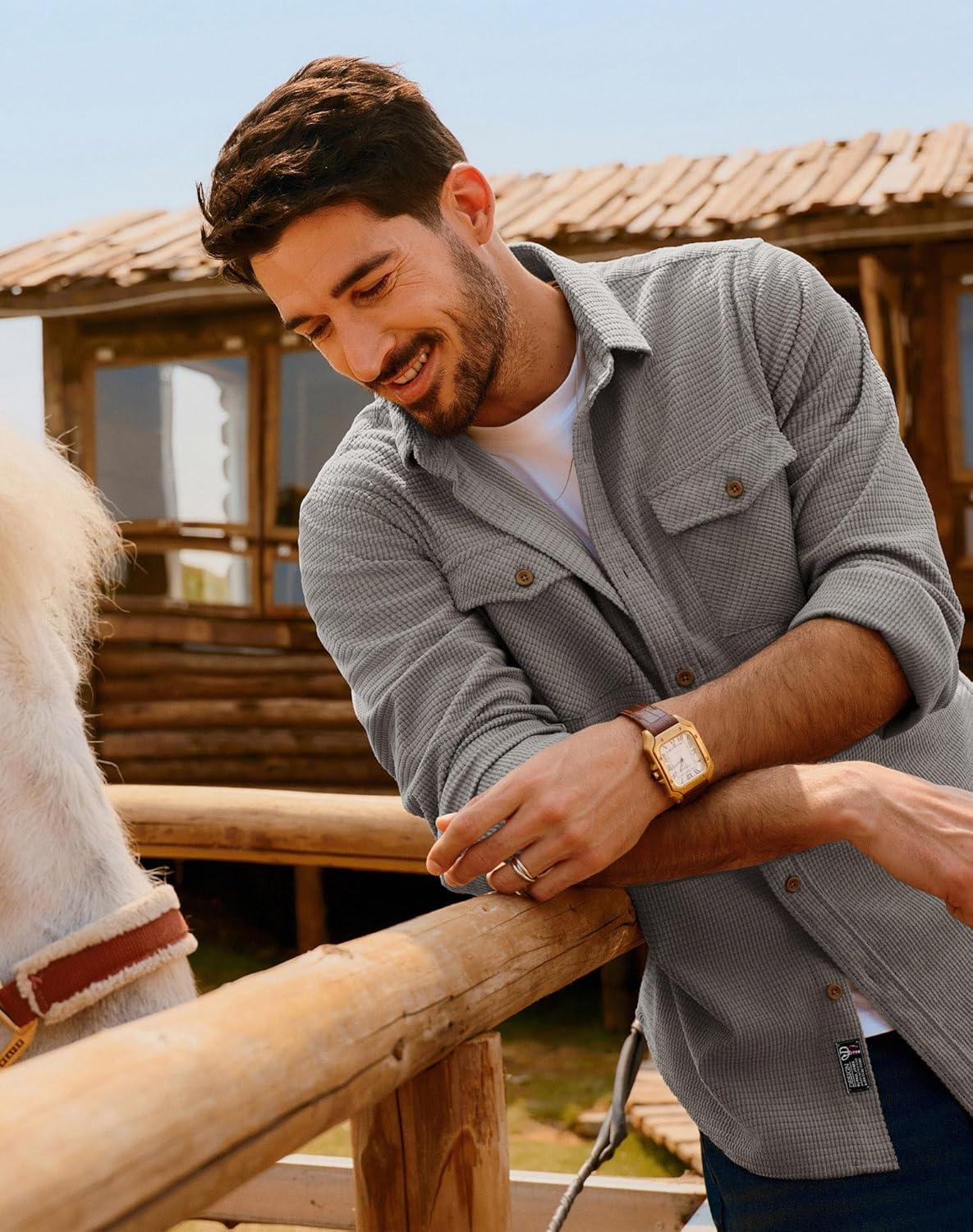 PJ PAUL JONES Men’s Button Down Waffle Textured Shirt Casual Long Sleeve Wrinkle Free Untucked Shirts with Flap Pockets(Khaki)