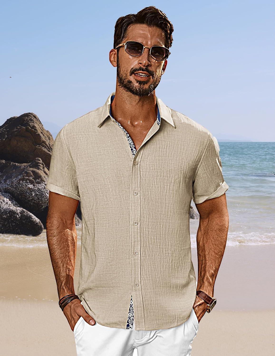 PJ PAUL JONES Men’s Casual Short Sleeve Button Down Shirt Summer Beach Wedding Shirt(Khaki)