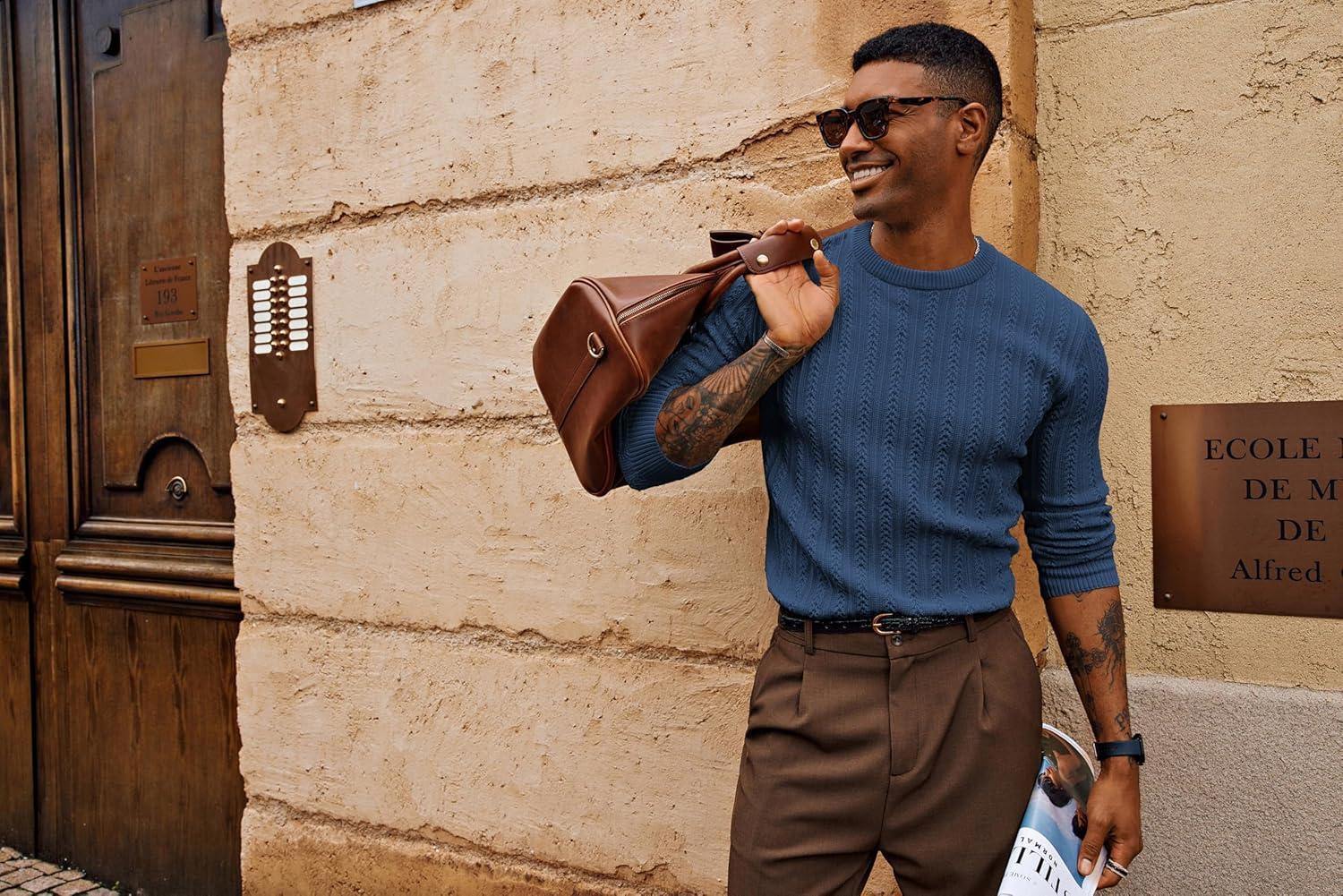 PJ PAUL JONES Mens Crew Neck Sweater Lightweight Cable Knitted Pullover Sweaters(Army Green)