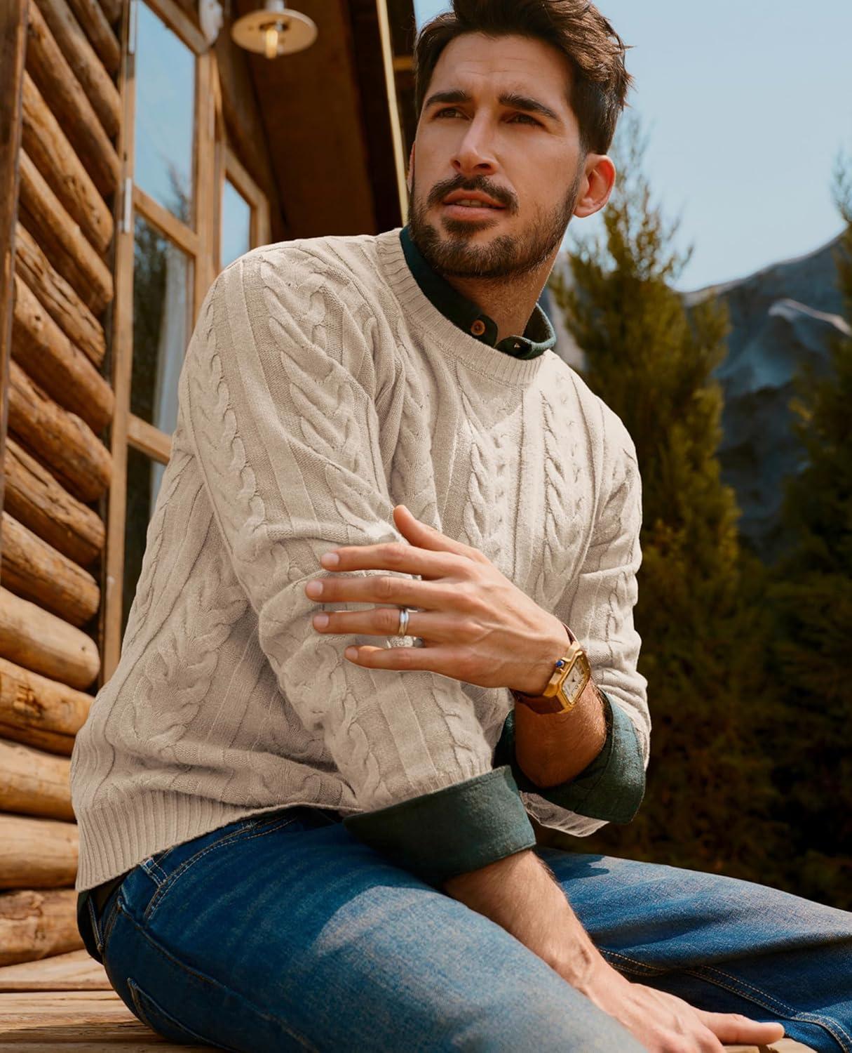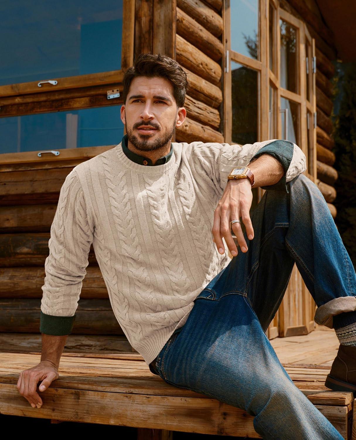 PJ PAUL JONES Mens Crewneck Sweater Cable Knit Pullover Sweaters Textured Long Sleeve Winter Sweaters(Apricot)