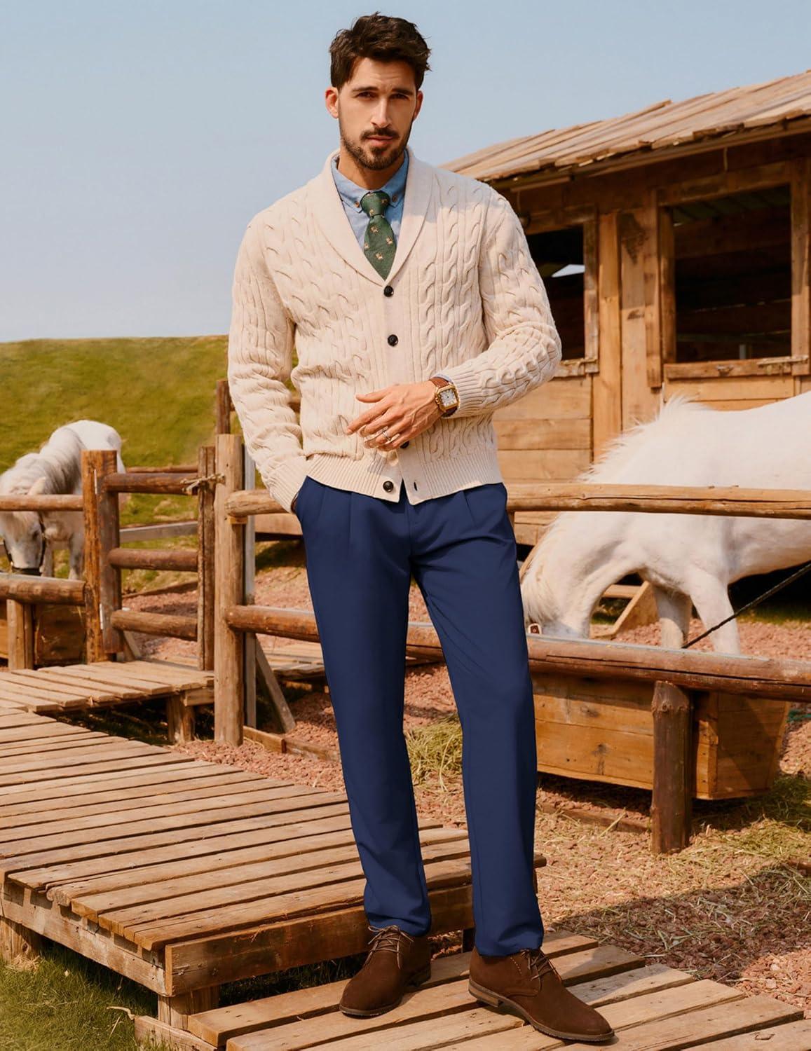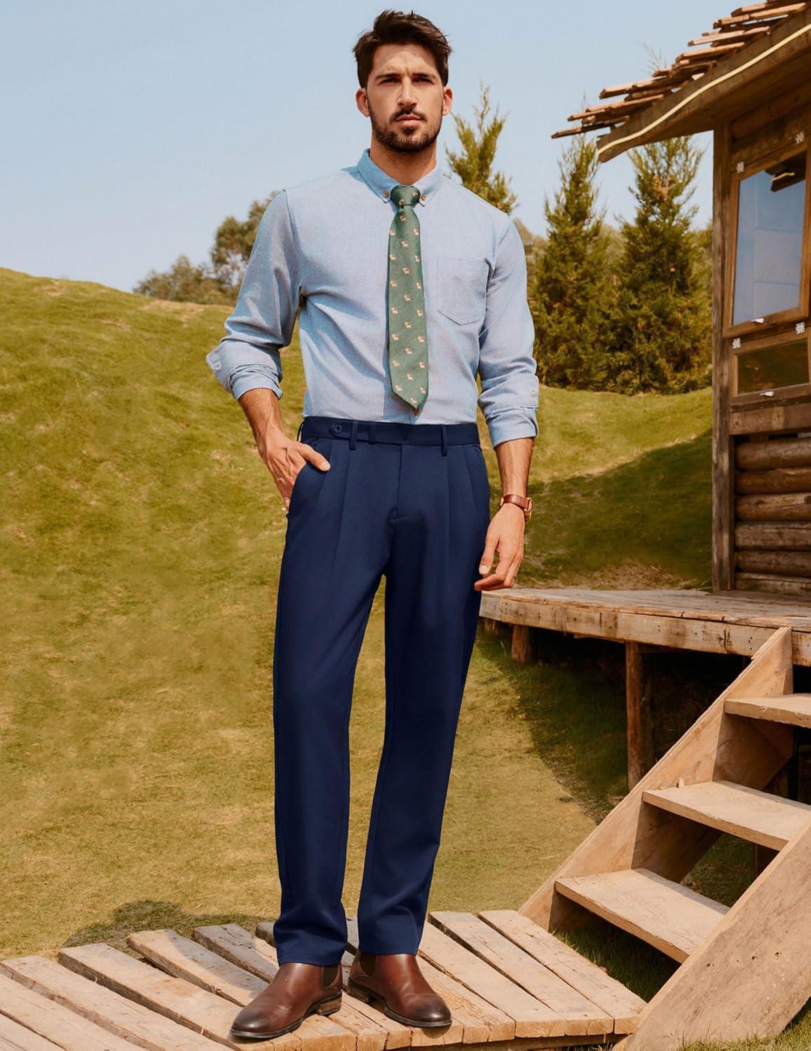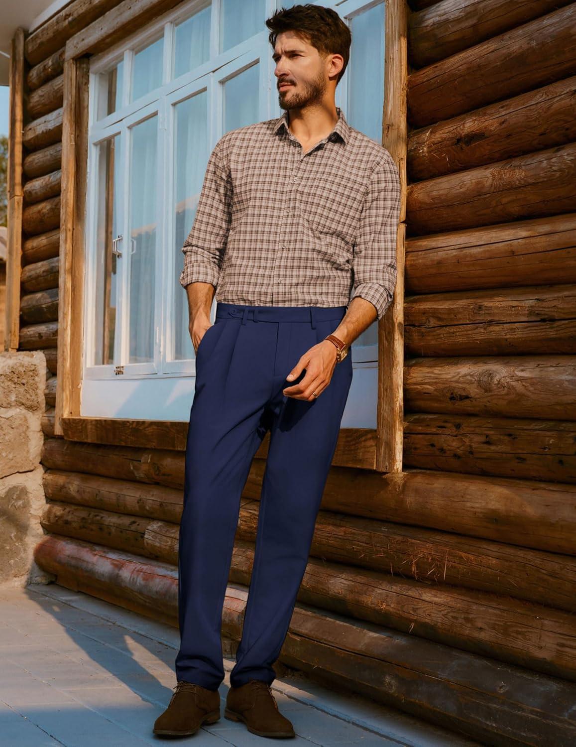PJ PAUL JONES Mens Dress Pants Vintage Pleated Tapered Cropped Trousers Extended Waist Dress Pant Casual Slacks(Dark Blue)