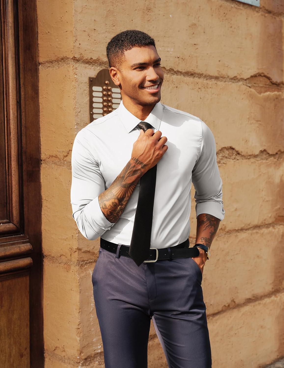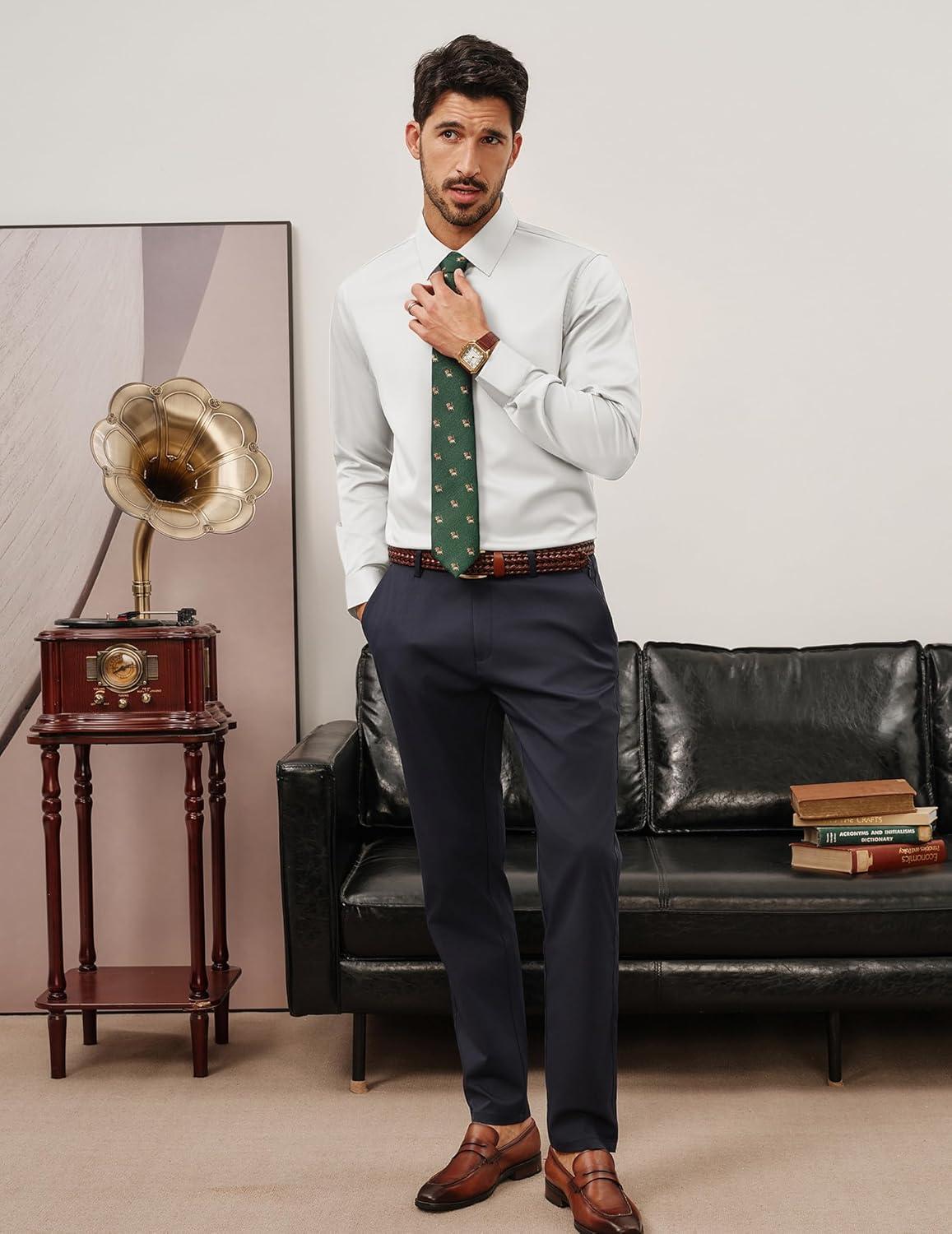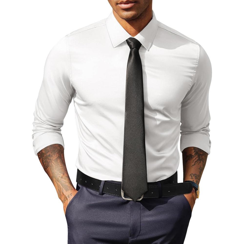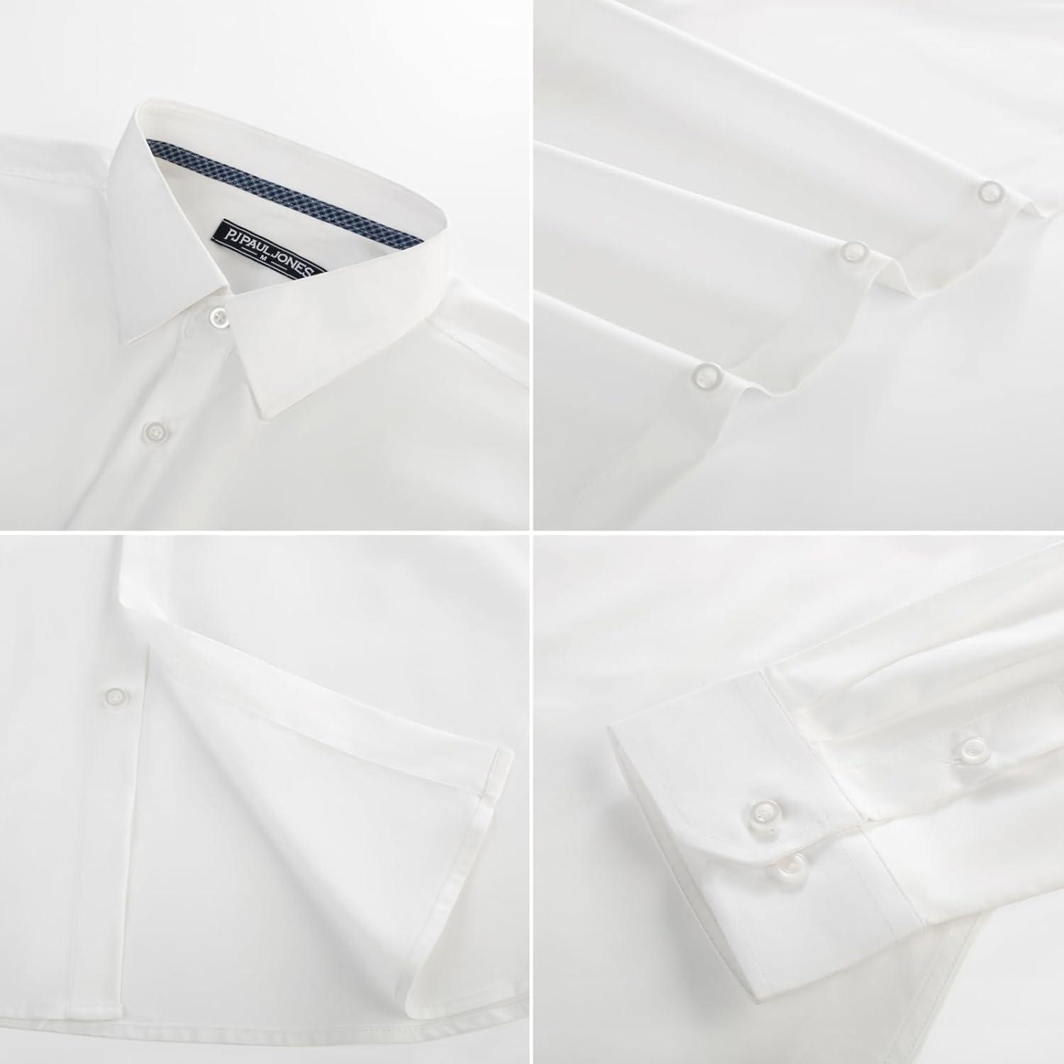 PJ PAUL JONES Men’s Dress Shirt Long Sleeve Stretch Casual Business Wrinkle Free Slim Fit Shirt for Wedding Office Travel(White)