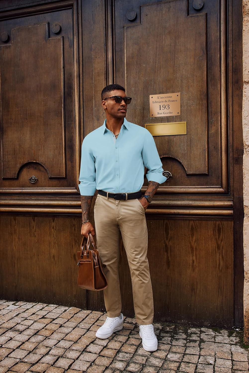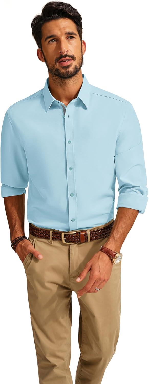 PJ PAUL JONES Mens Dress Shirts Wrinkle Free Stretch Button Down Shirt Casual Long Sleeve Business Shirts(Sky Blue)