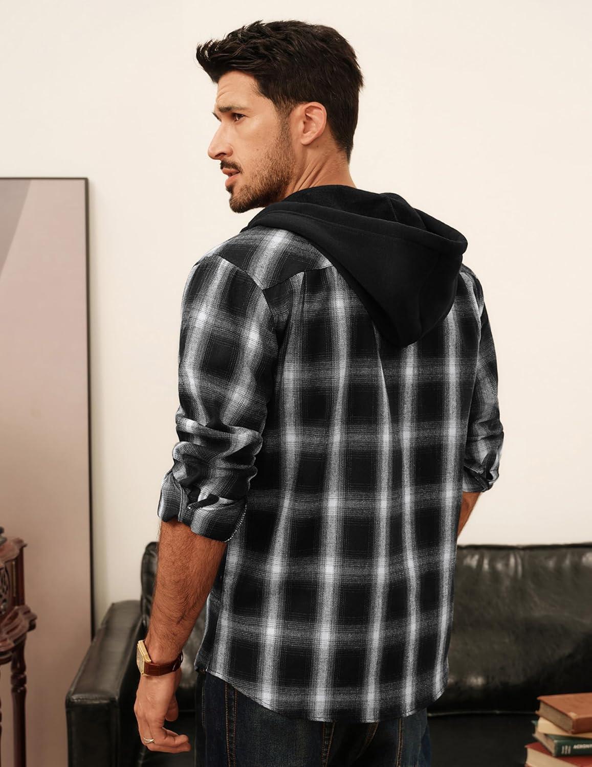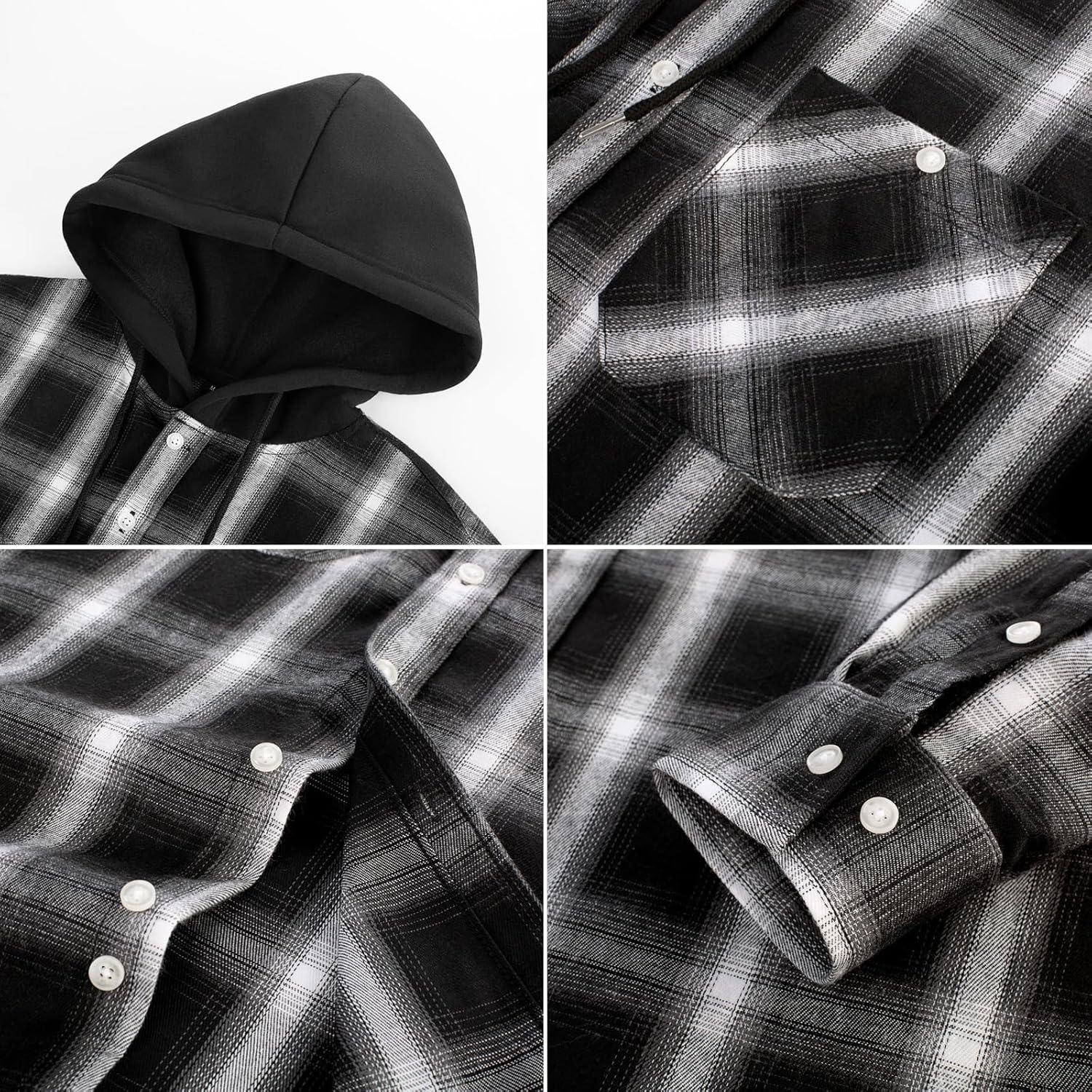 PJ PAUL JONES Men’s Flannel Shirt Plaid Hoodie Casual Shirt Long Sleeve Lightweight Shirt Jackets(Hooded White Black)