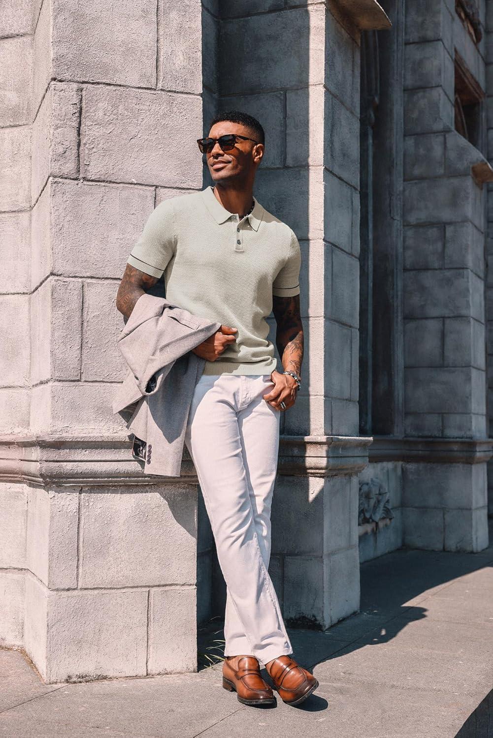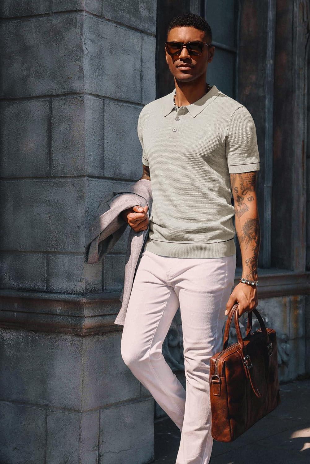 PJ PAUL JONES Mens Knit Polo Shirts Short Sleeve Textured Polo Shirts Sretchy Regular Fit(Dusty Pink)