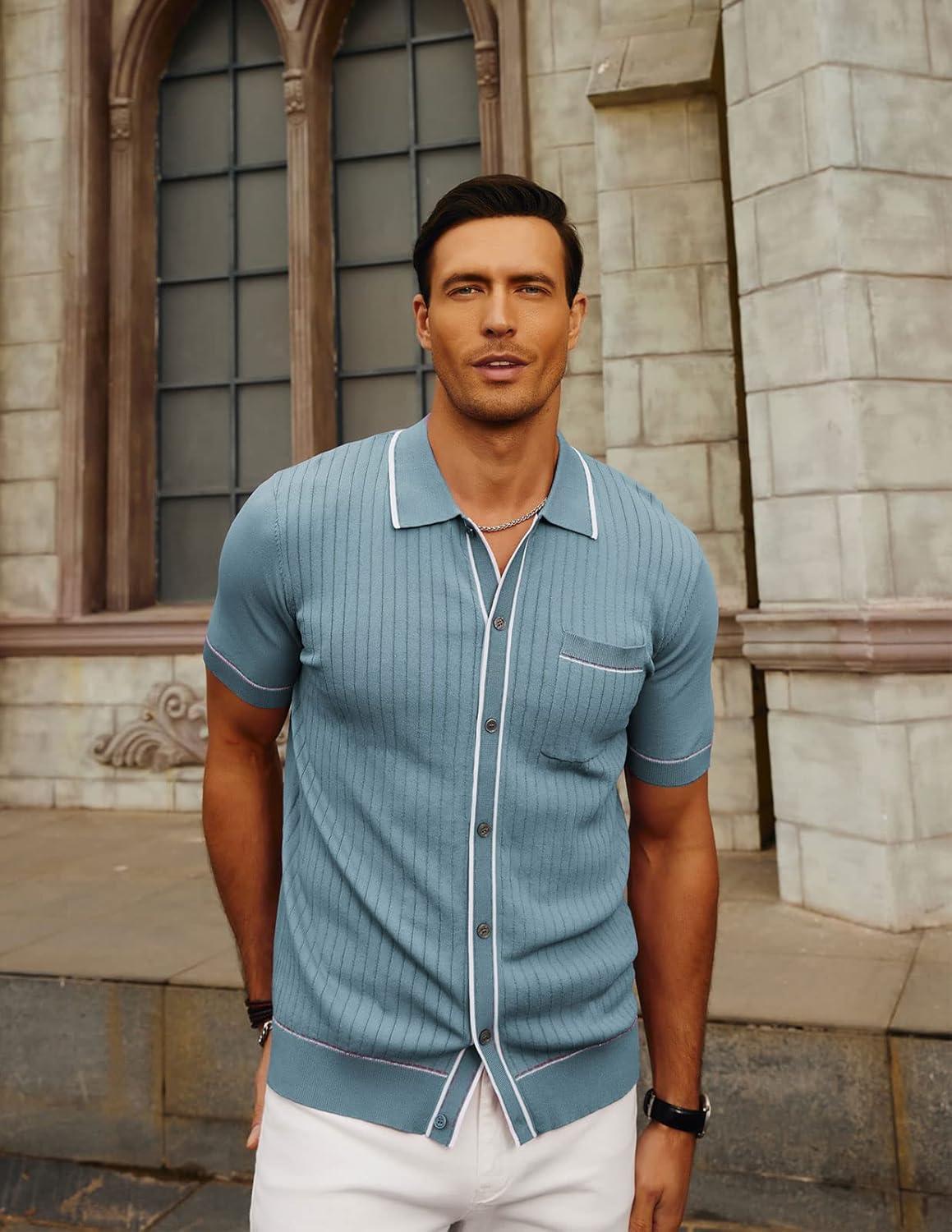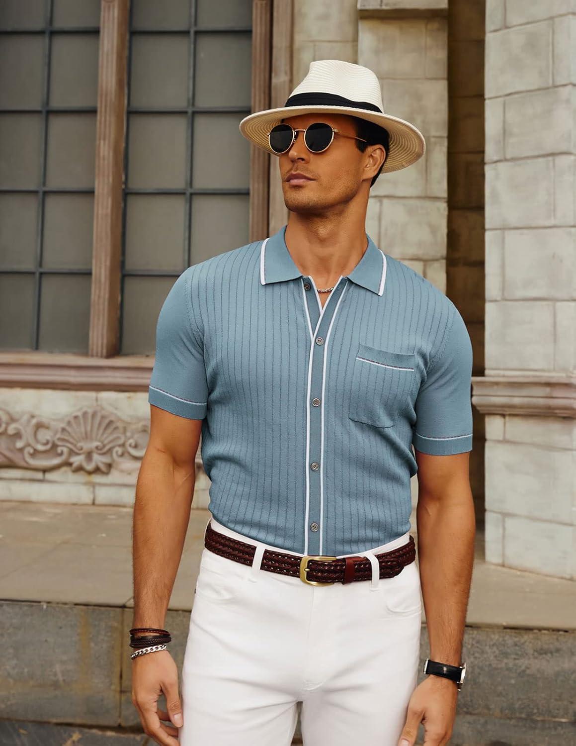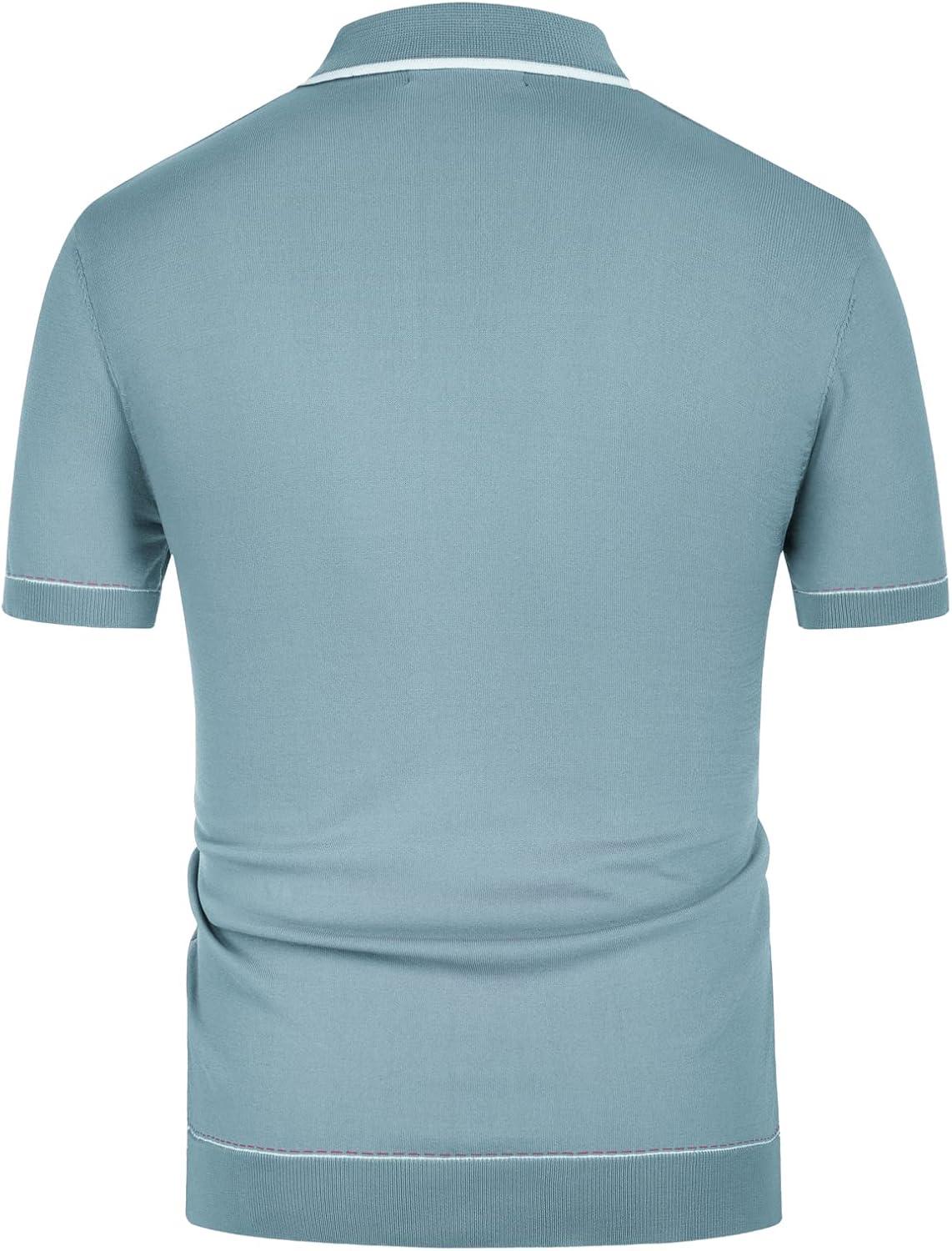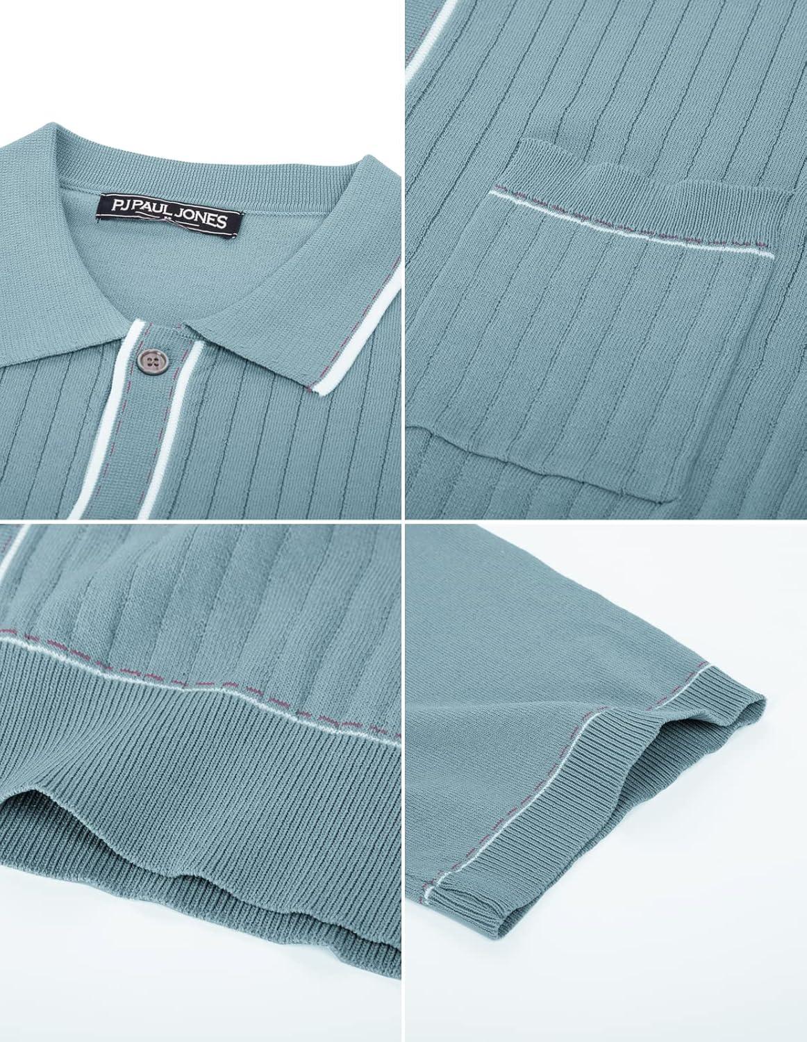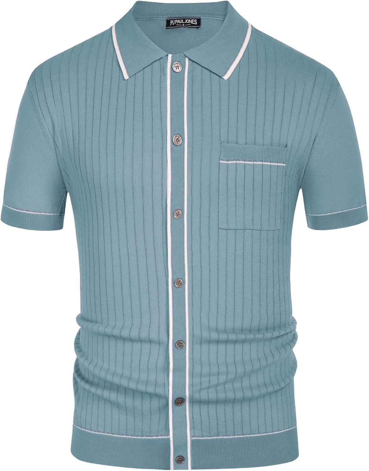 PJ PAUL JONES Mens Knit Shirts Vintage Retro Short Sleeve Button Down Vacation Polo Shirts(Blue)