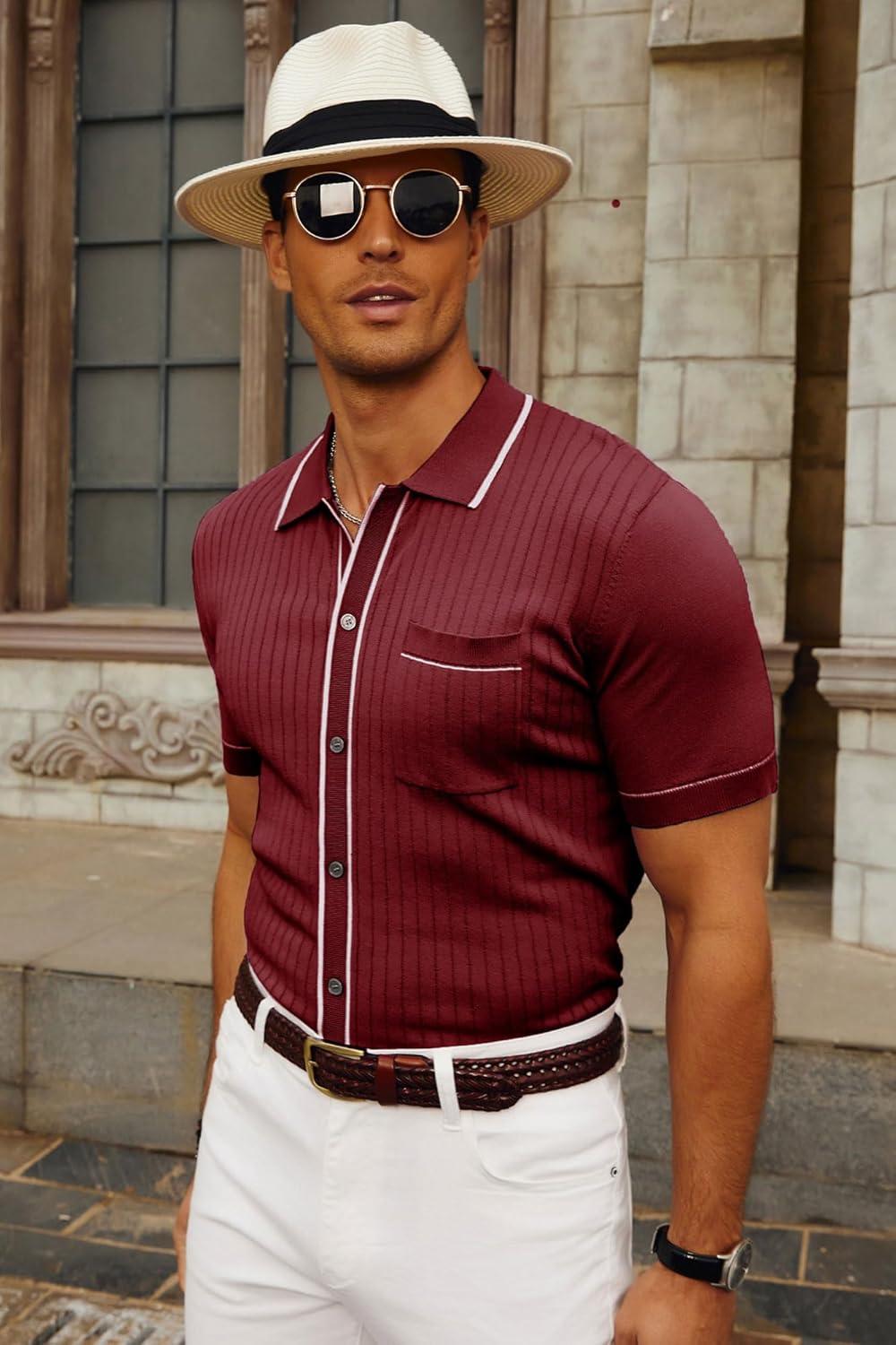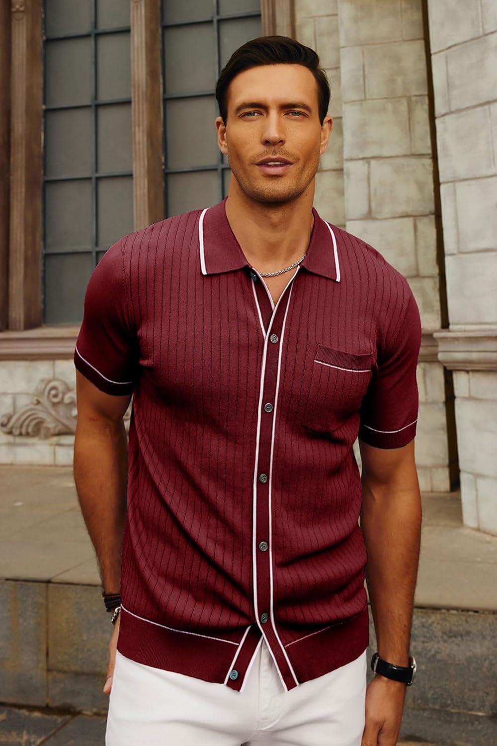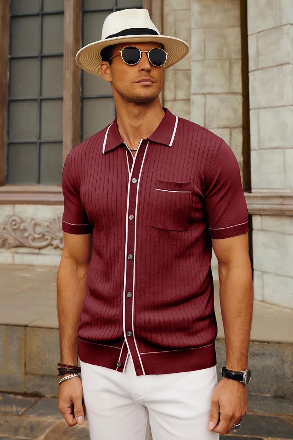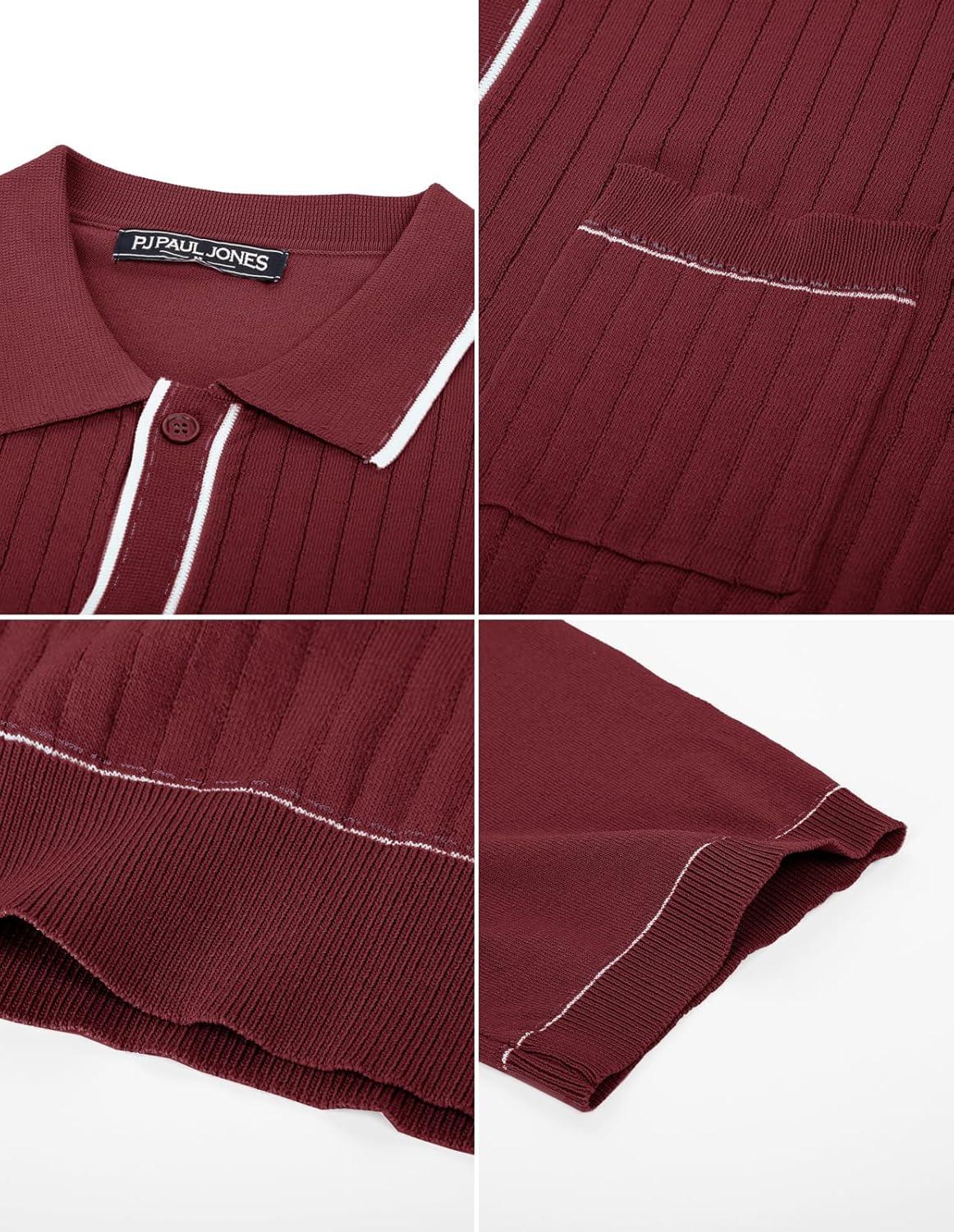 PJ PAUL JONES Mens Knit Shirts Vintage Retro Short Sleeve Button Down Vacation Polo Shirts(Burgundy)