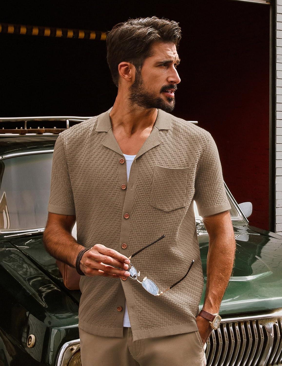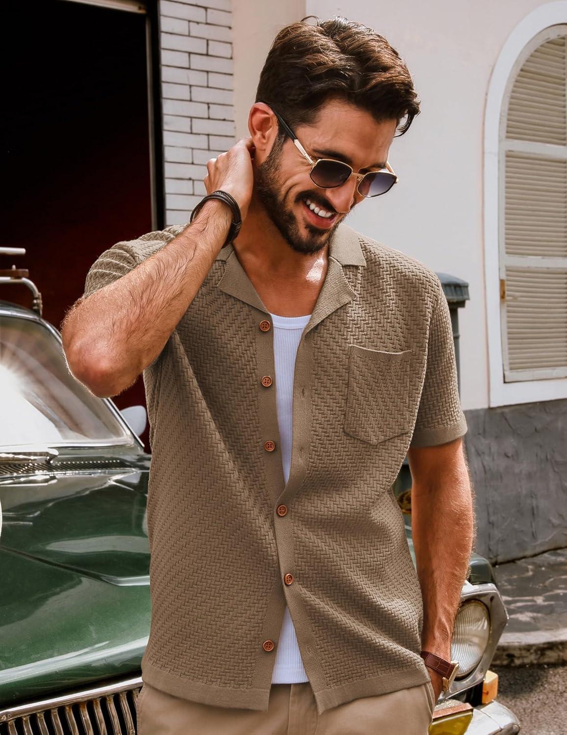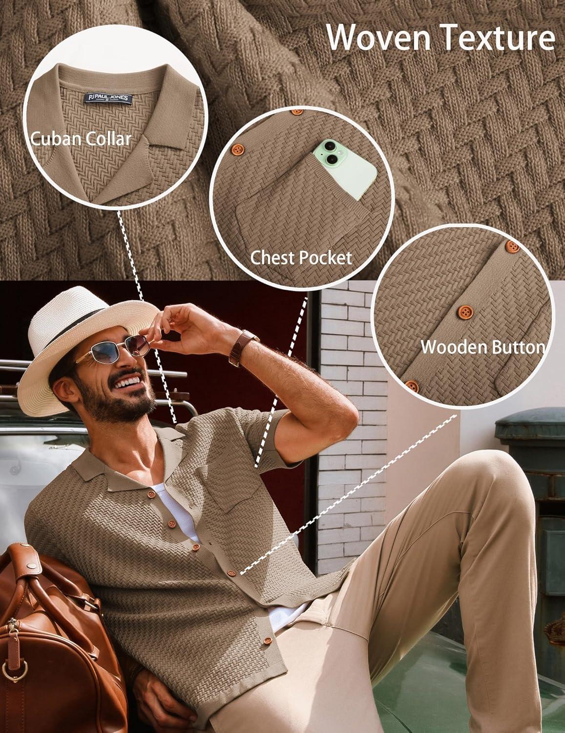 PJ PAUL JONES Mens Knit Shirts Vintage Retro Short Sleeve Button Down Vacation Polo Shirts(Camel37)