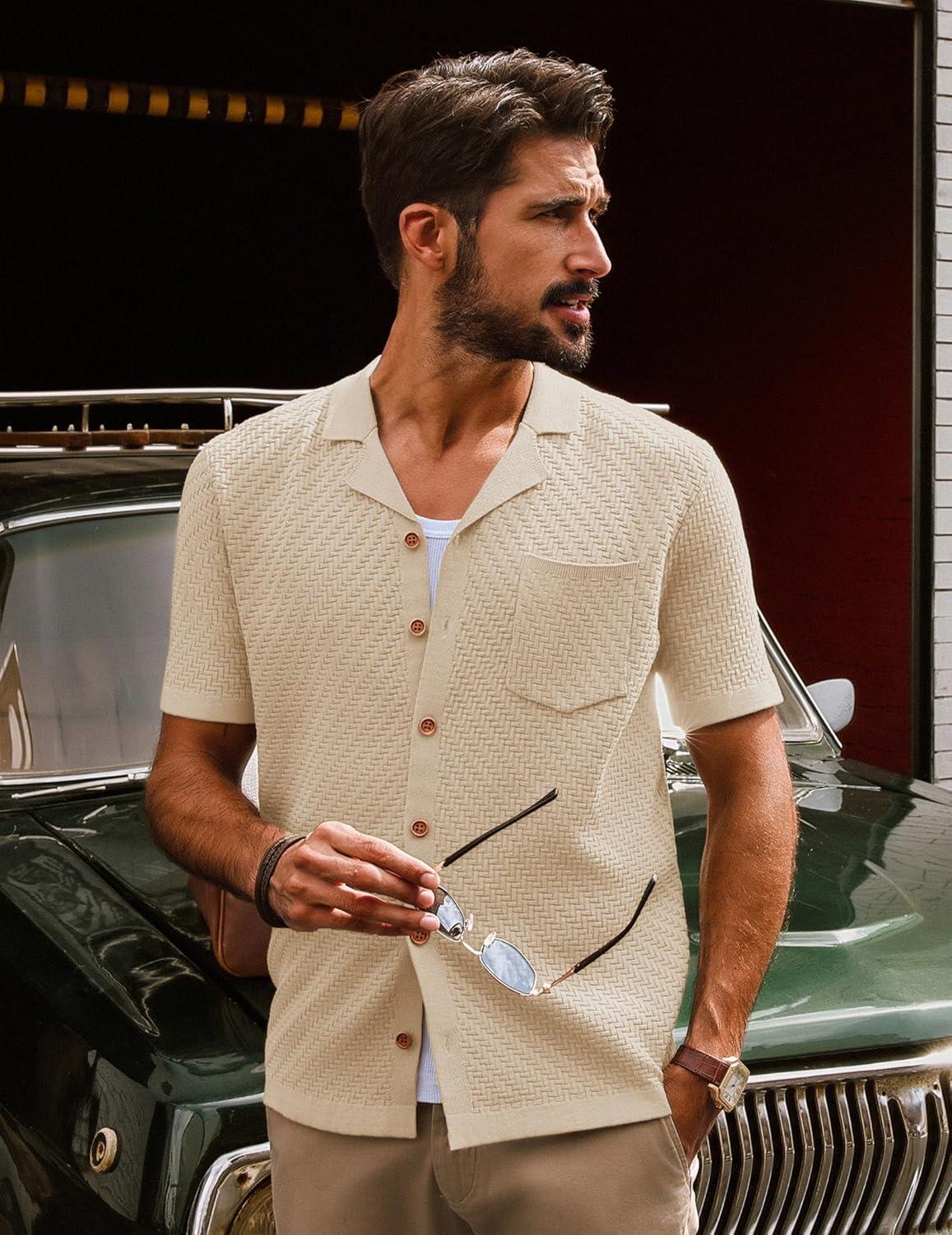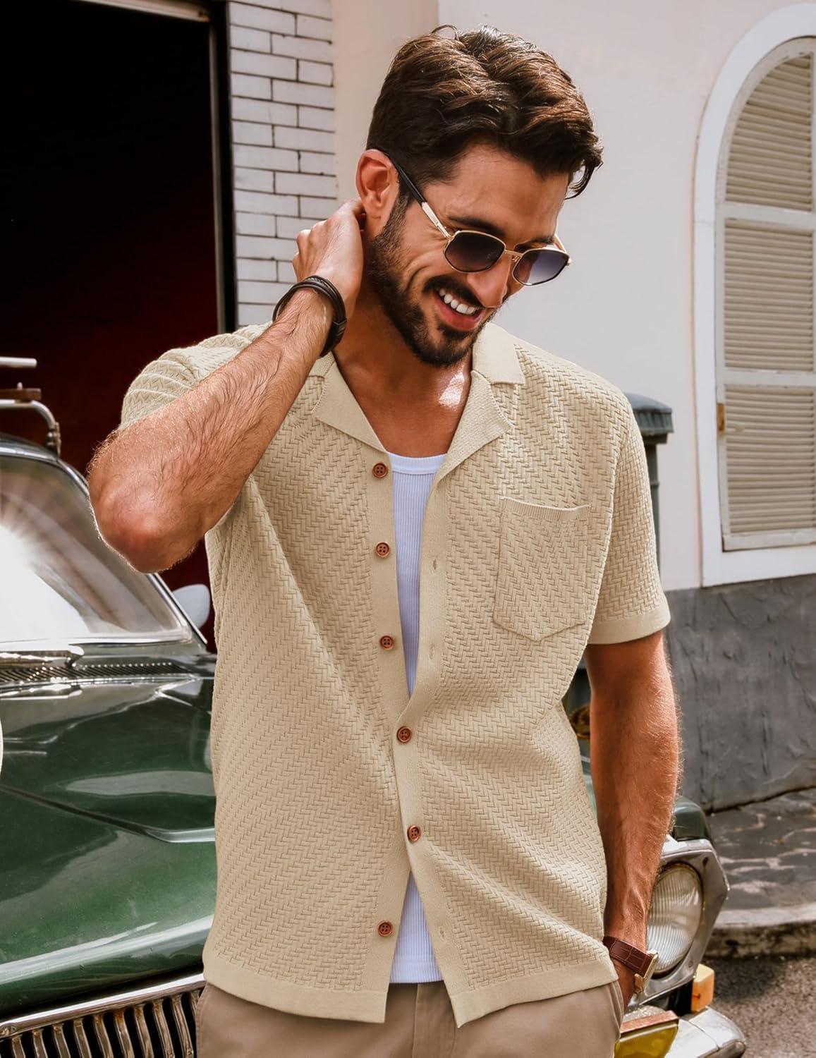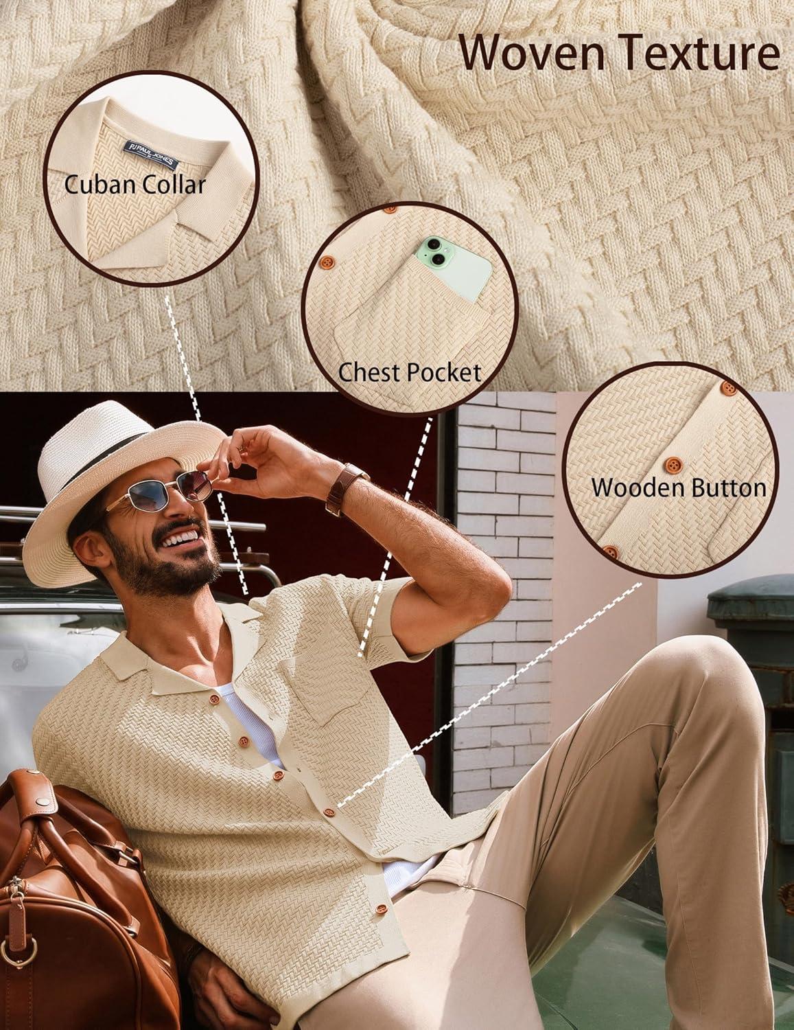 PJ PAUL JONES Mens Knit Shirts Vintage Retro Short Sleeve Button Down Vacation Polo Shirts(Light Apricot37)