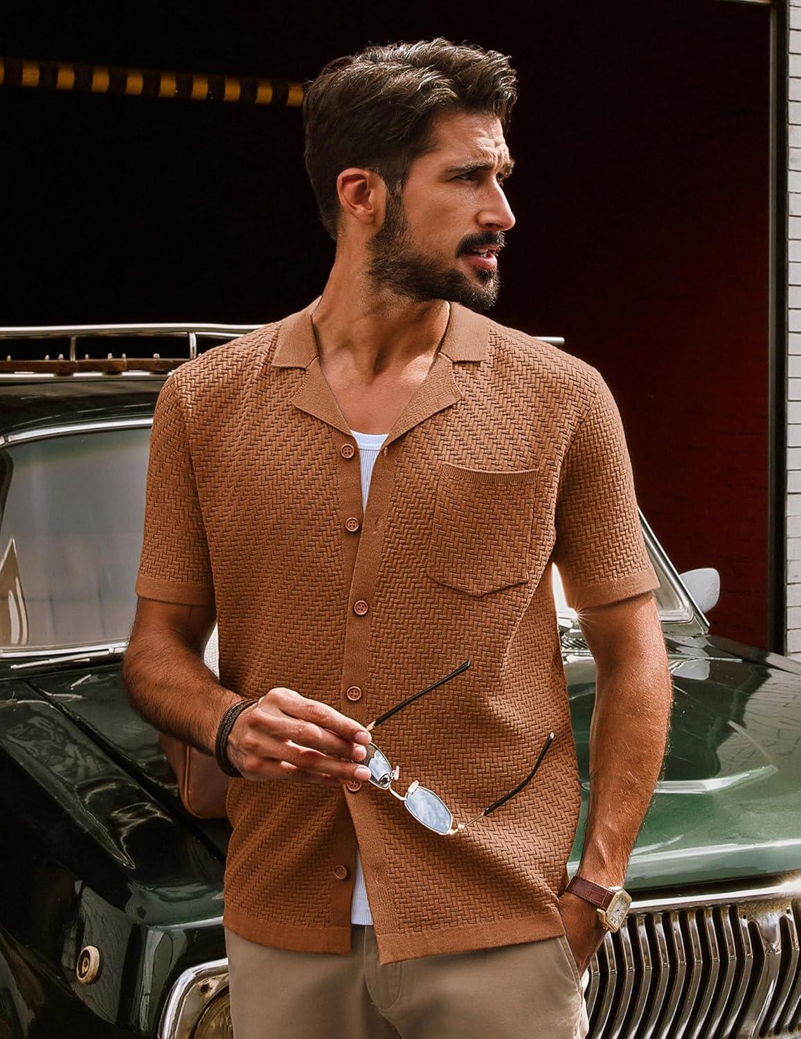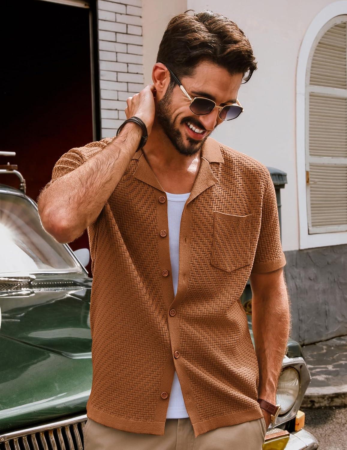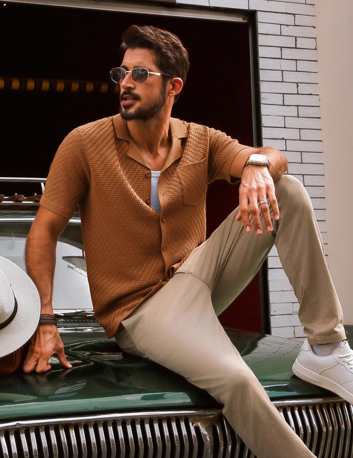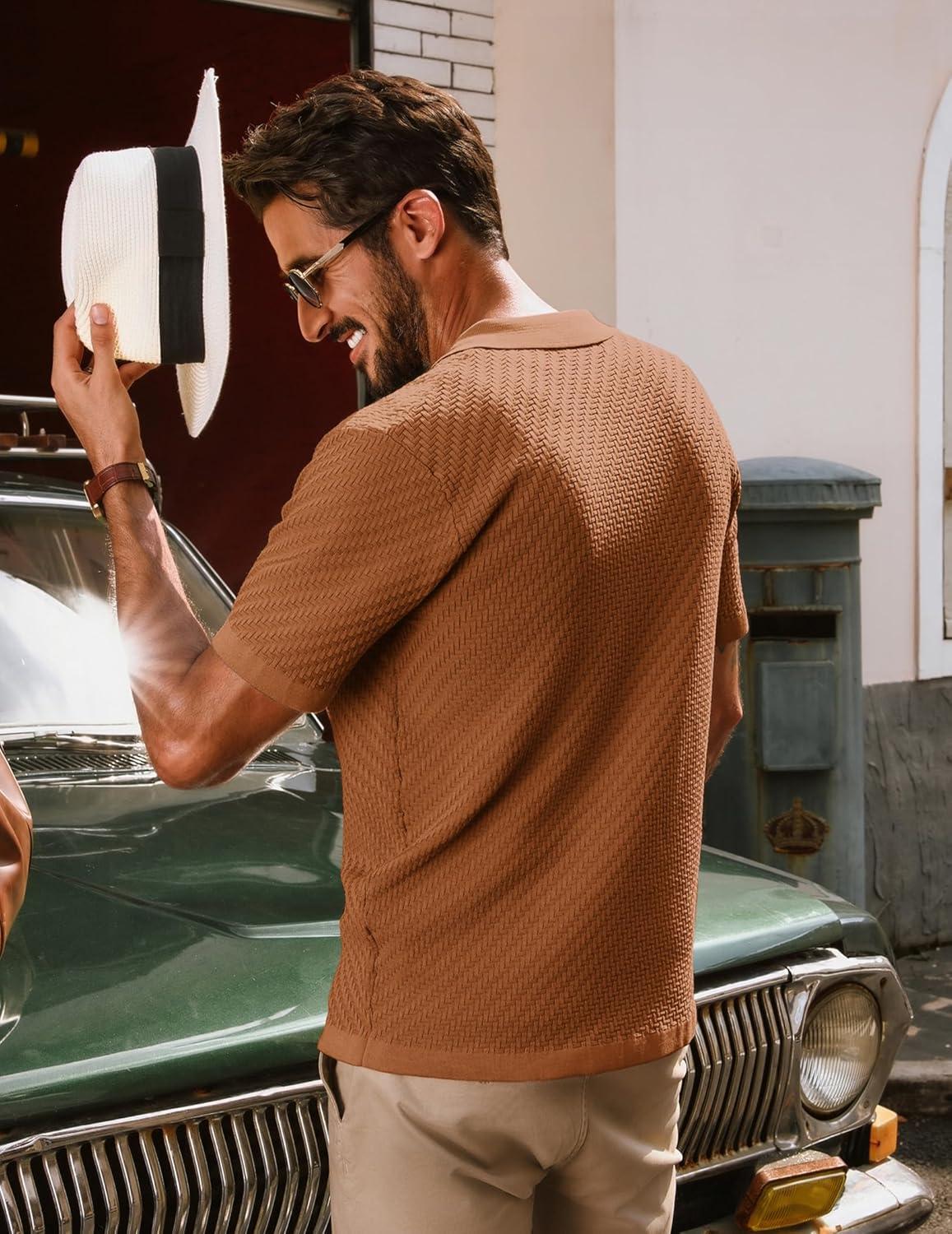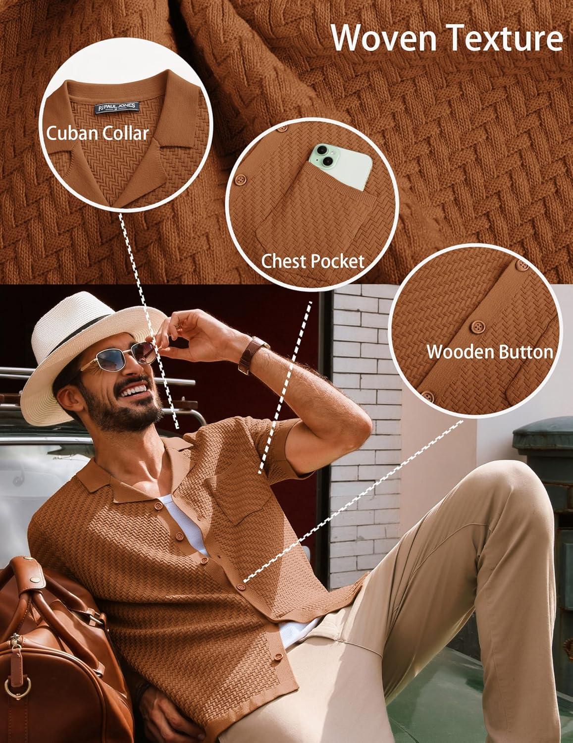 PJ PAUL JONES Mens Knit Shirts Vintage Retro Short Sleeve Button Down Vacation Polo Shirts(Red Coffee37)