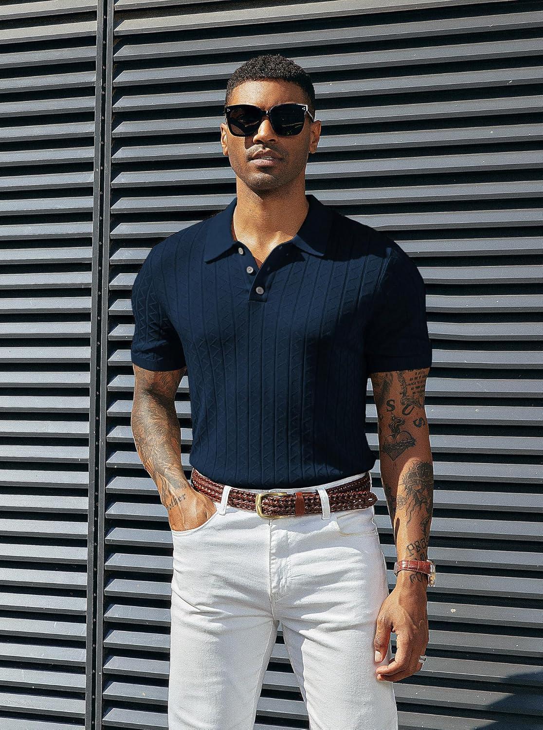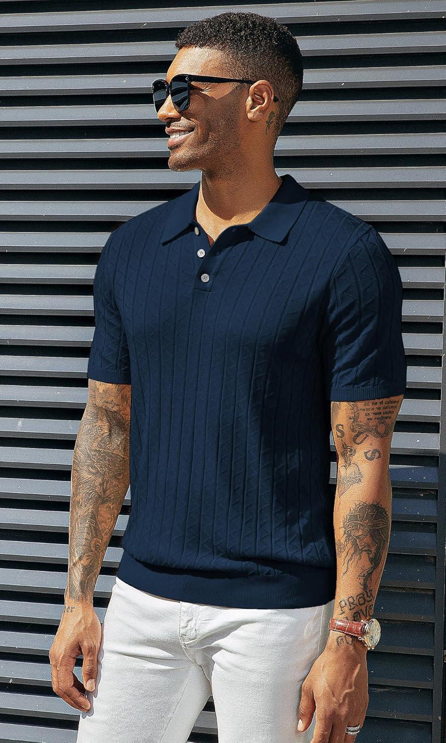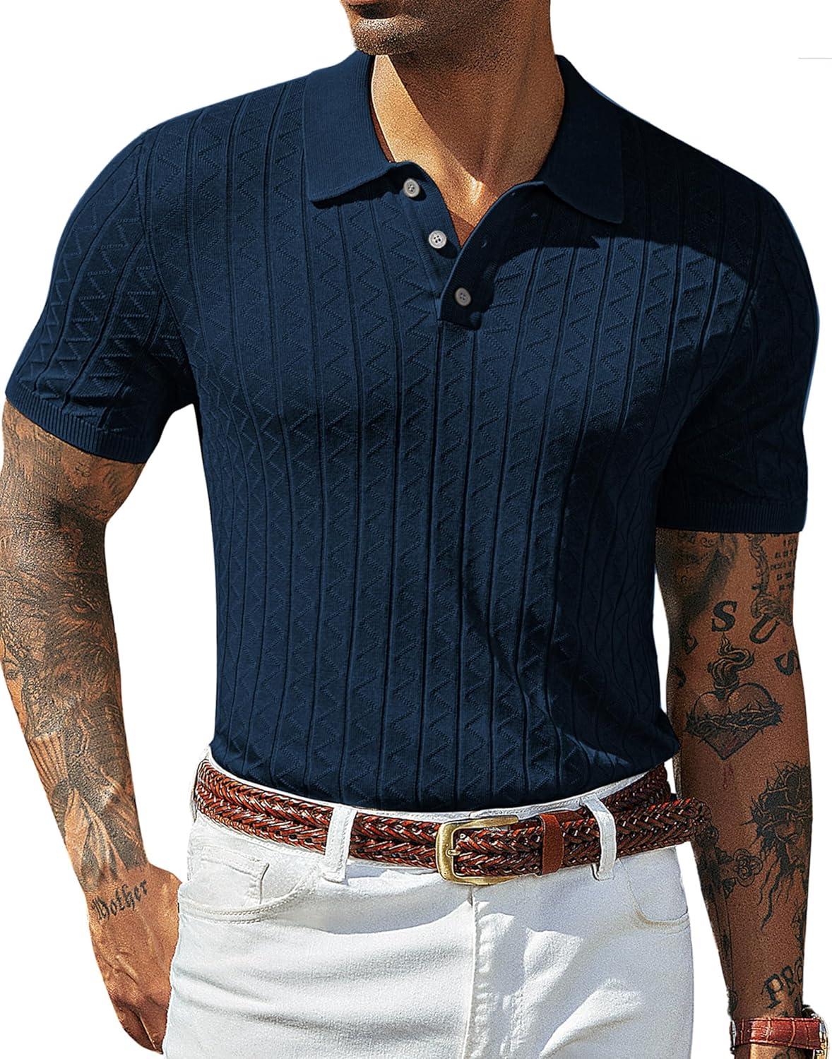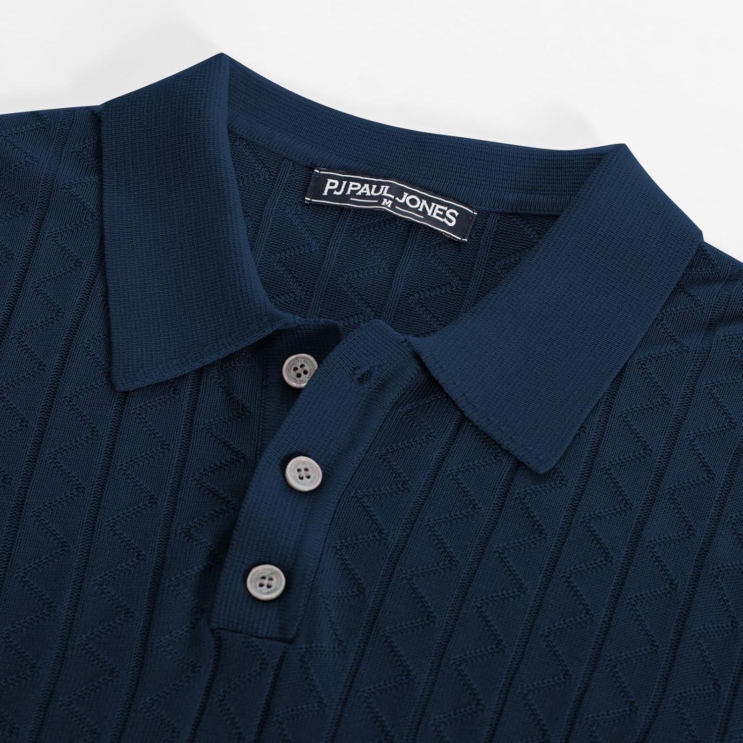 PJ PAUL JONES Mens Knitted Polo Shirts Short Sleeve Textured Pullover Golf Polo T Shirts(Navy Blue-wavy)