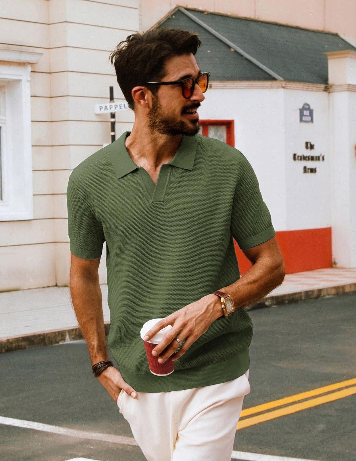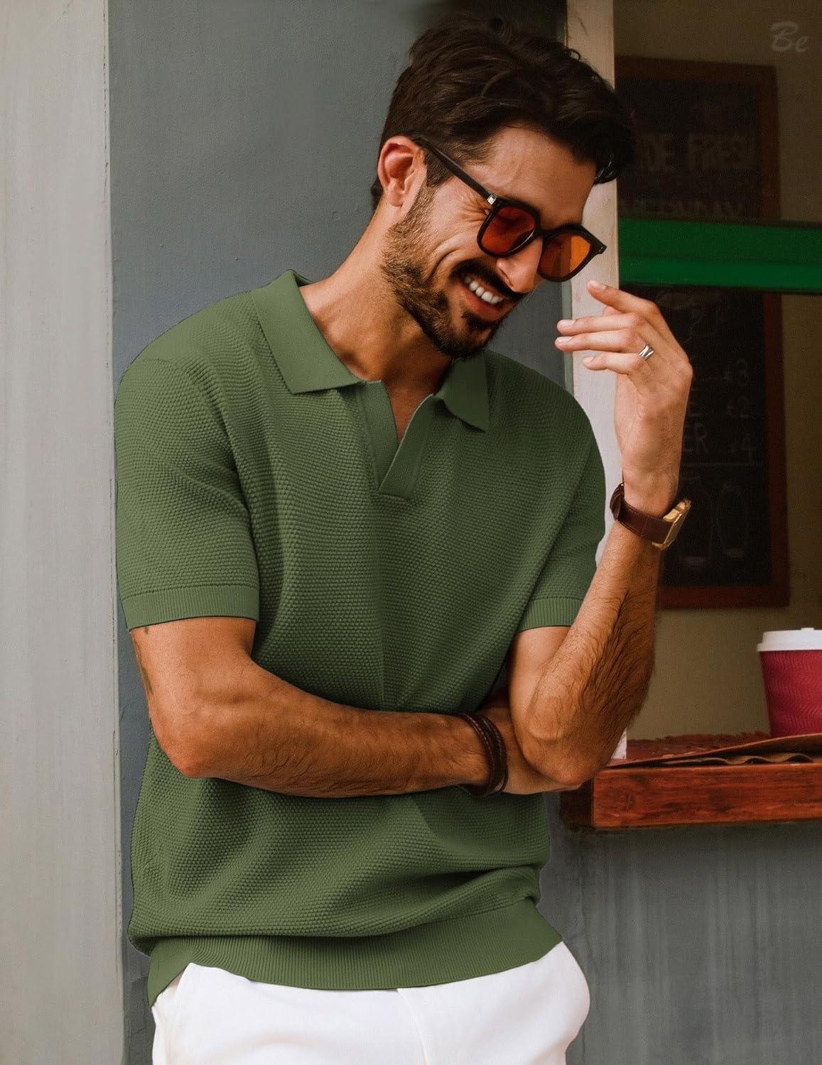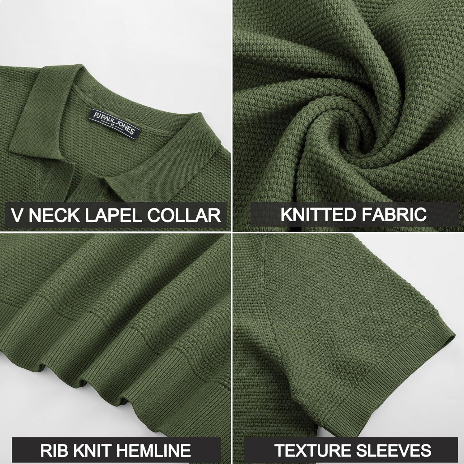 PJ PAUL JONES Mens Polo Shirts Short Sleeve V Neck Knit Textured Polo Knitted Golf Shirt(Army Green)