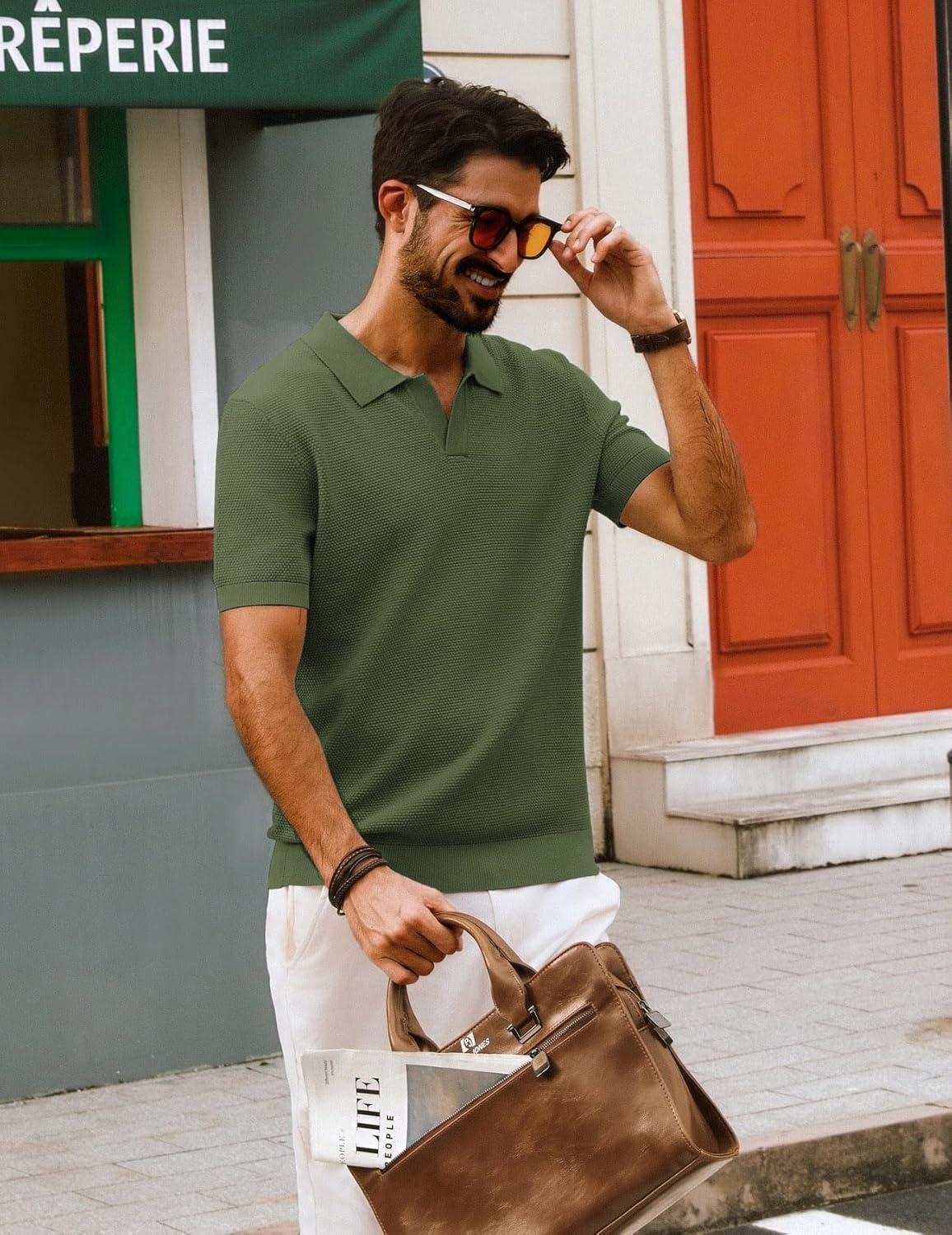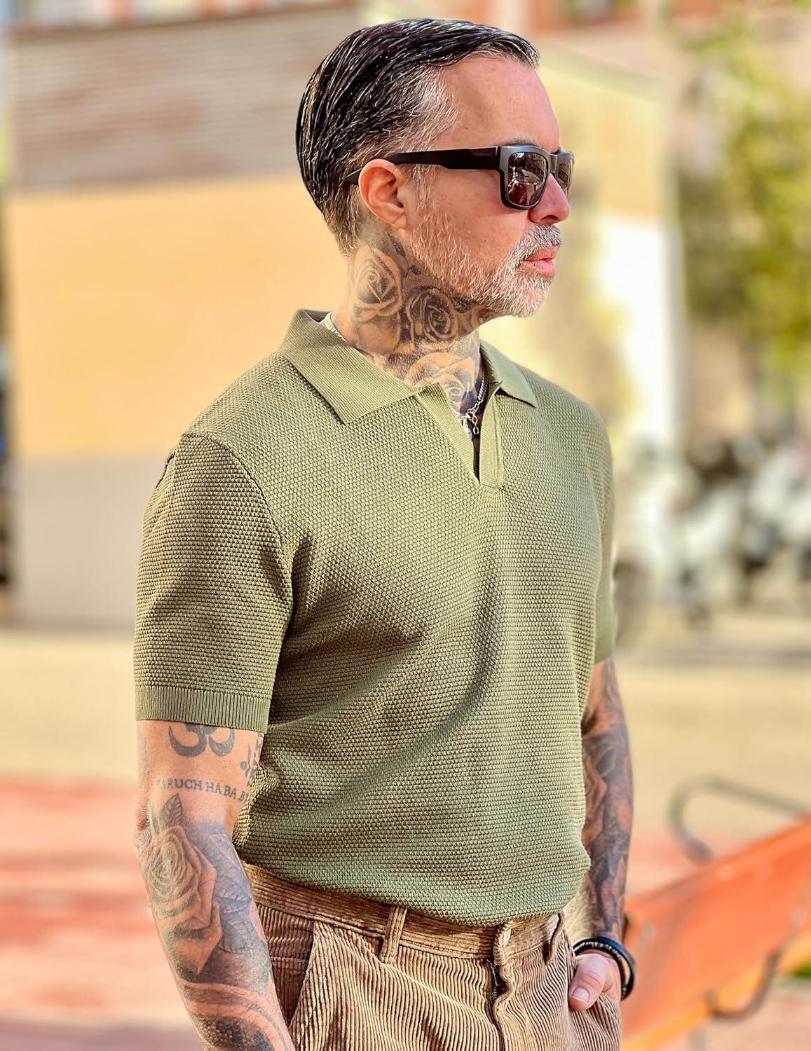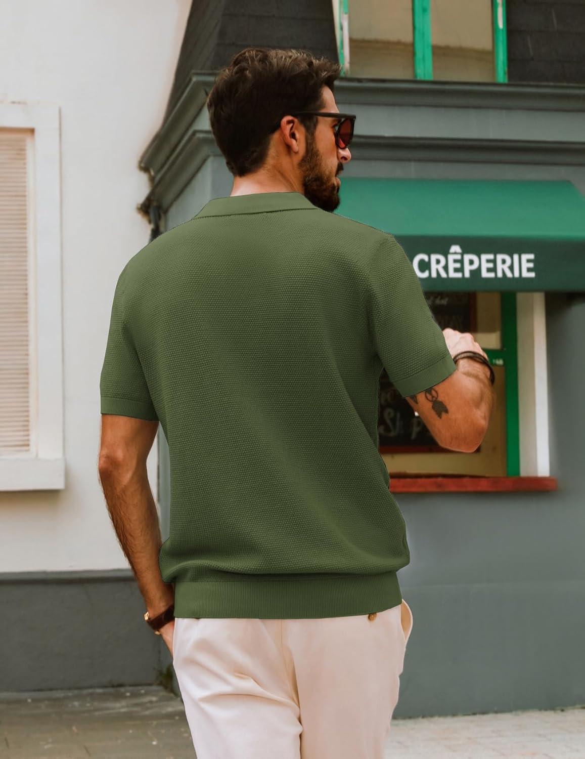 PJ PAUL JONES Mens Polo Shirts Short Sleeve V Neck Knit Textured Polo Knitted Golf Shirt(Army Green)