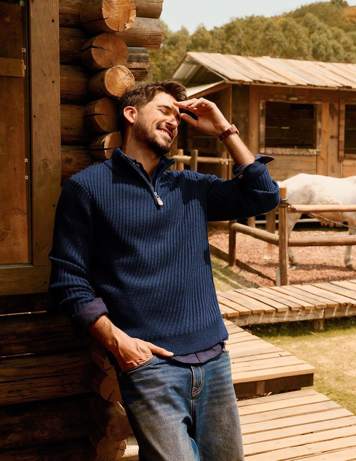 PJ PAUL JONES Mens Quarter Zip Pullover Sweaters Casual Knit Twill Texture Sweater(Navy Blue)