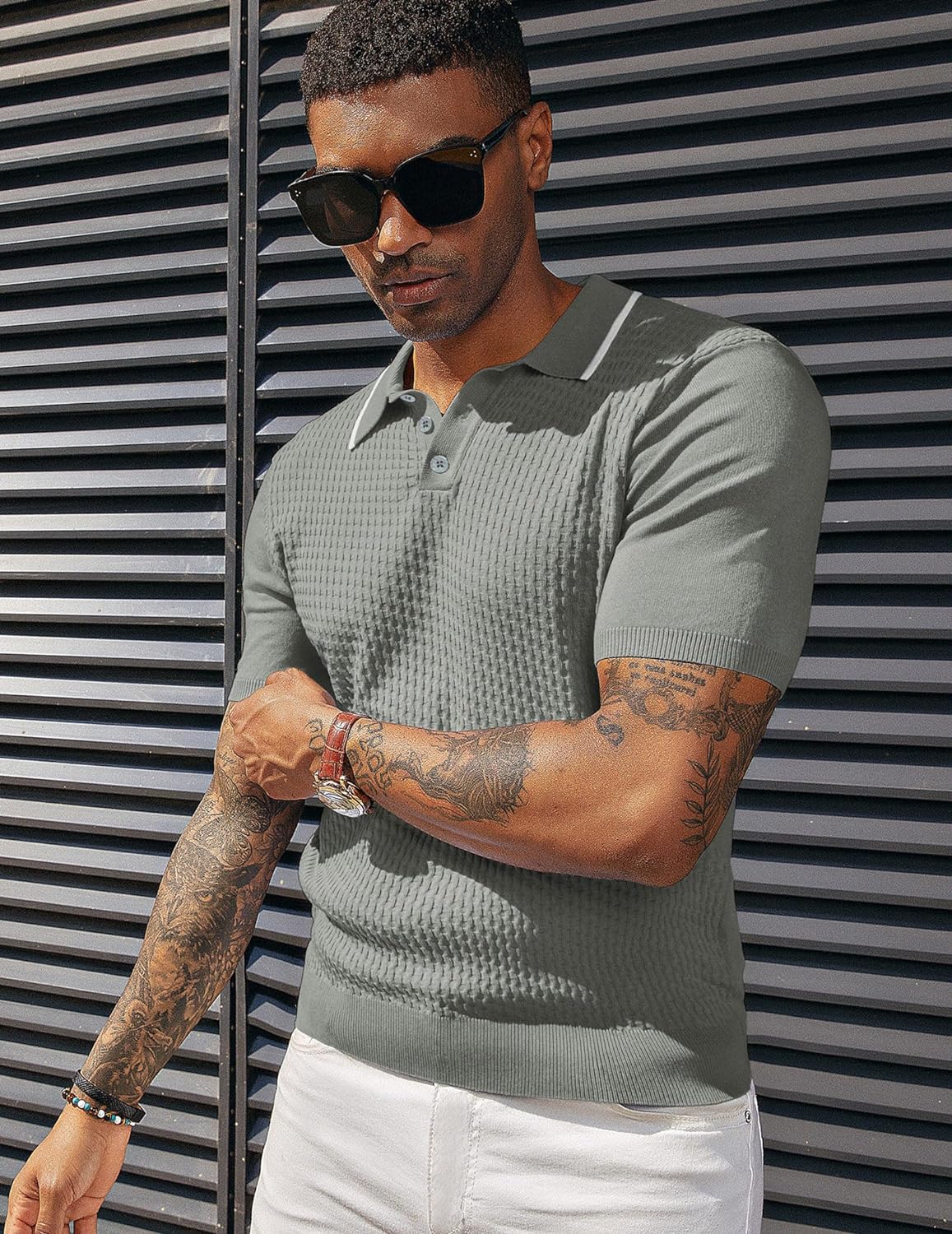 PJ PAUL JONES Men’s Short Sleeve Knit Polo Shirts Waffle Texture Knit Shirt(Grey)