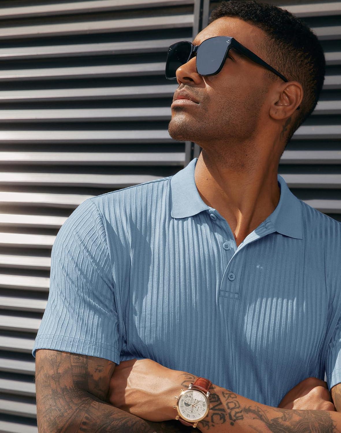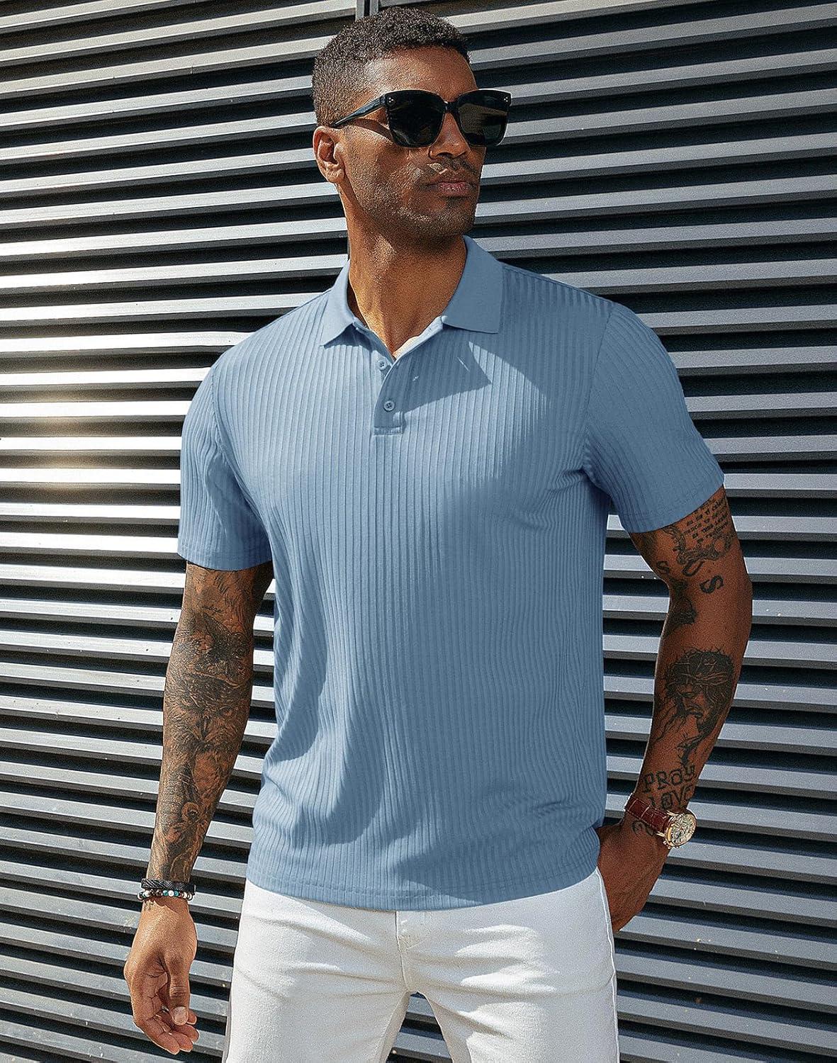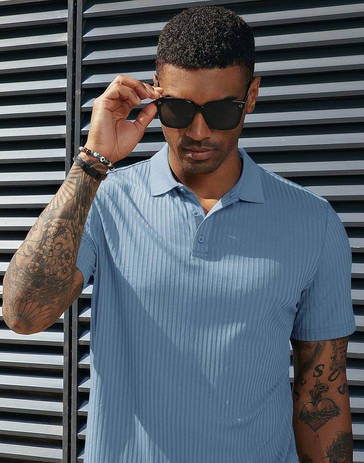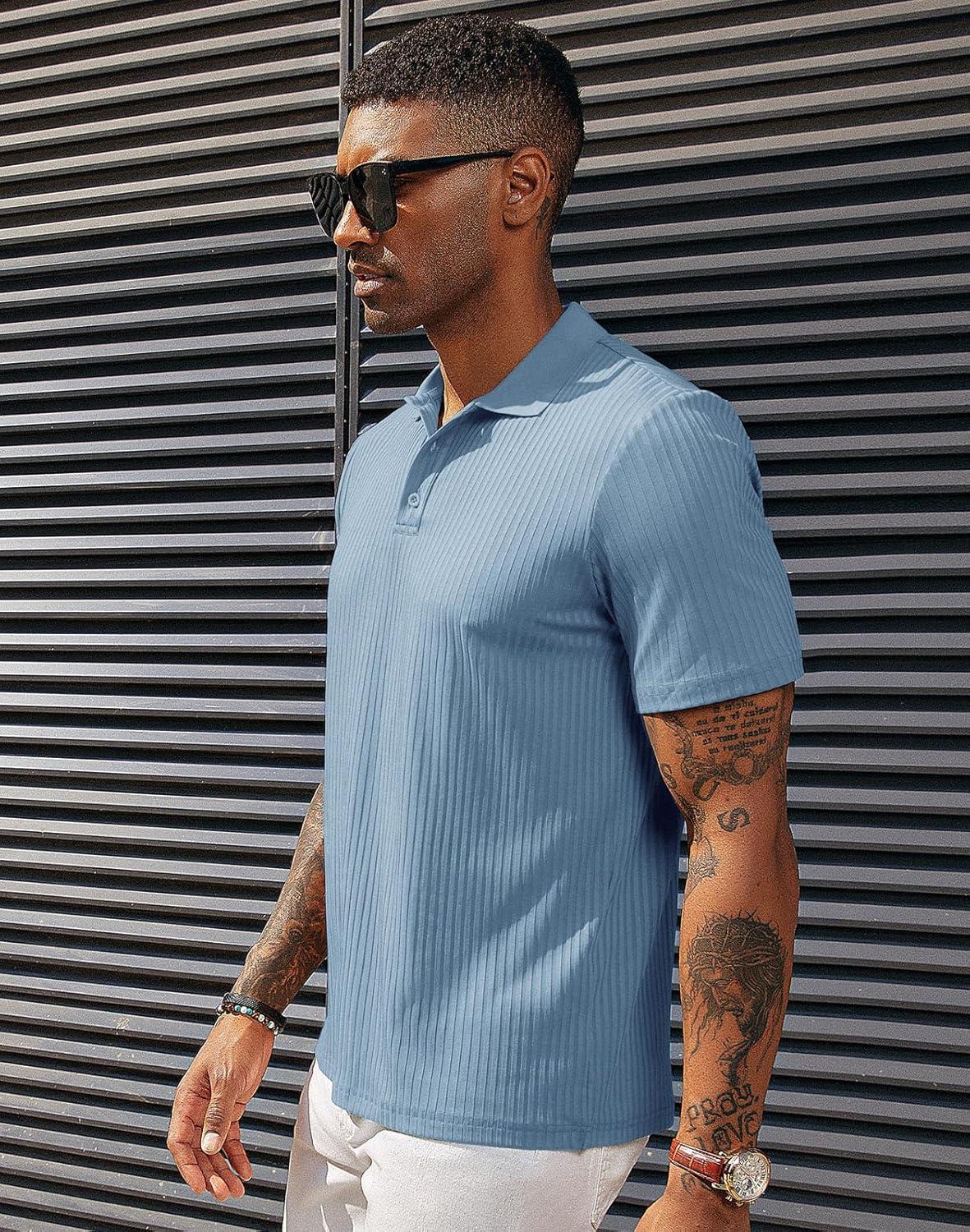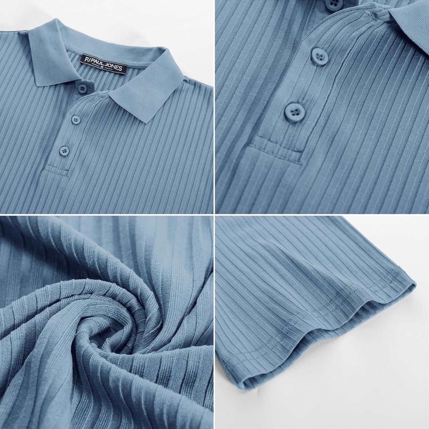 PJ PAUL JONES Mens Short Sleeve Texture Polo Shirts Casual Wrinkle Free Stretch Knit Golf Shirt Tops(Light Blue)