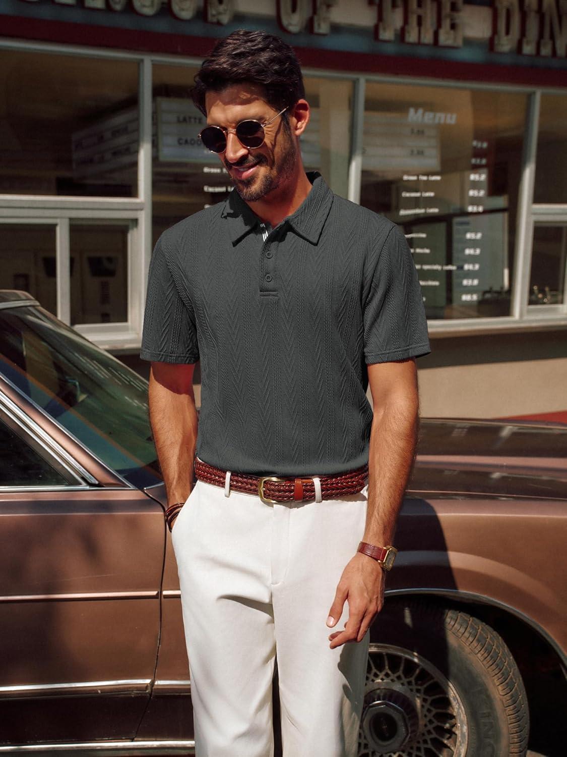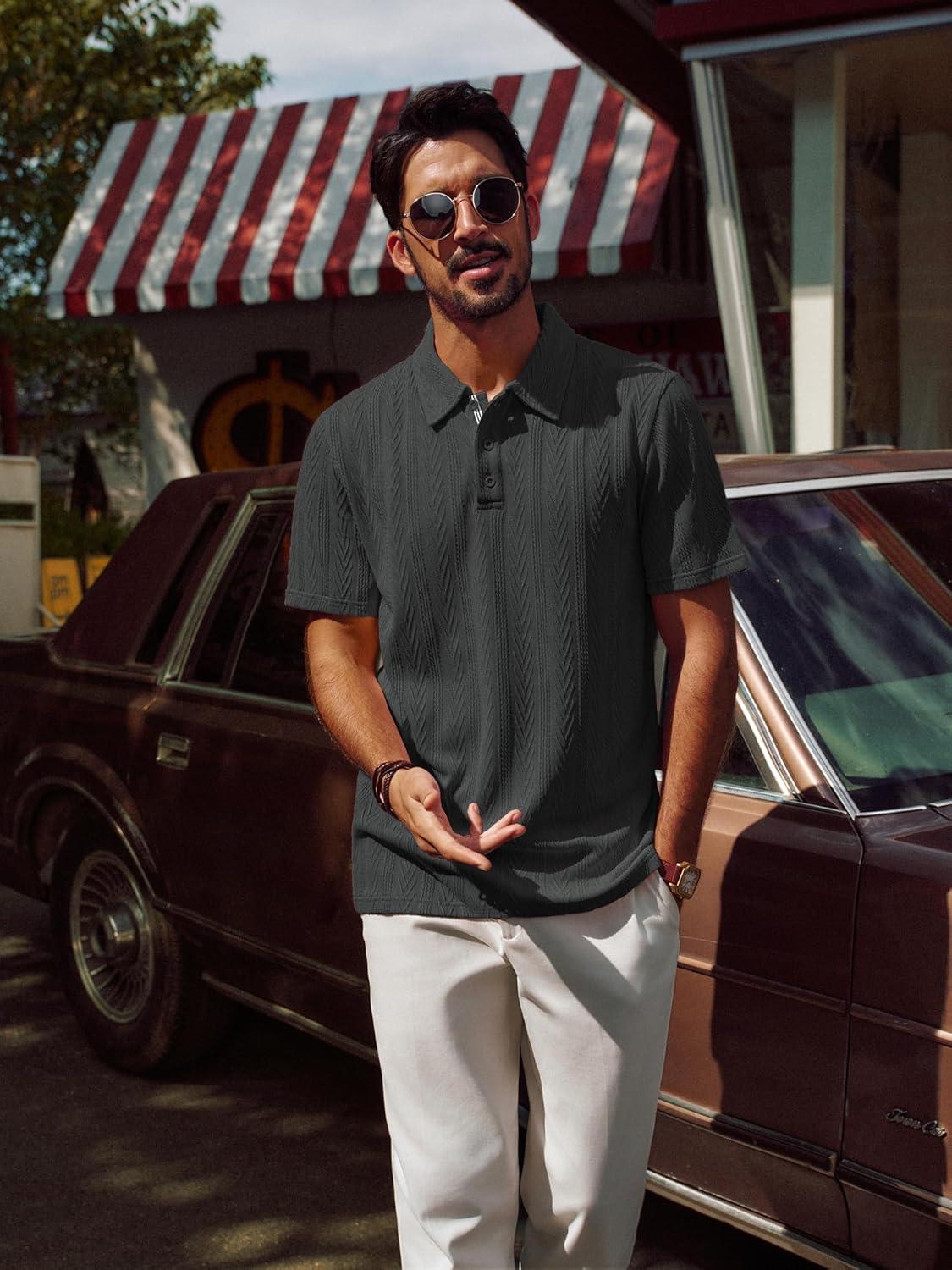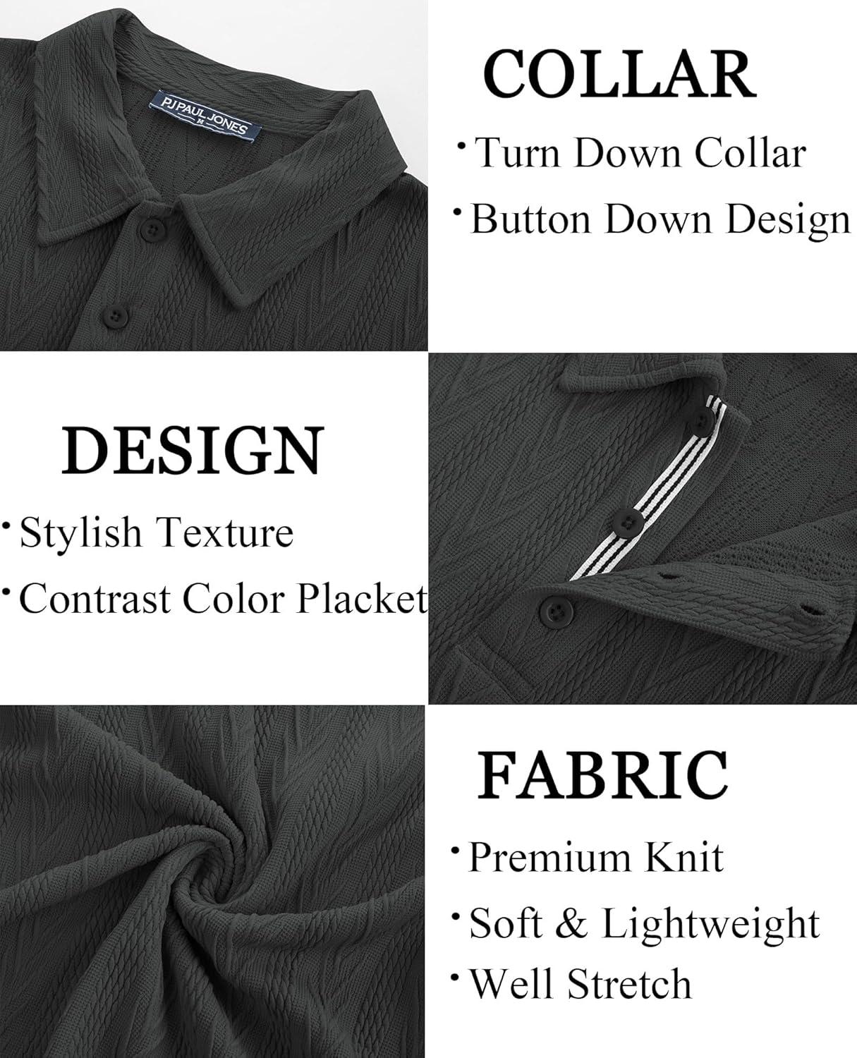 PJ PAUL JONES Men’s Textured Knit Polo Shirt Short Sleeve Regular Fit Stretch Collared Summer Shirts(Dark Gray)
